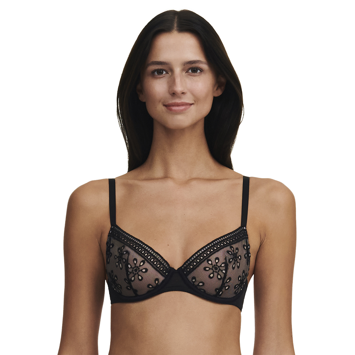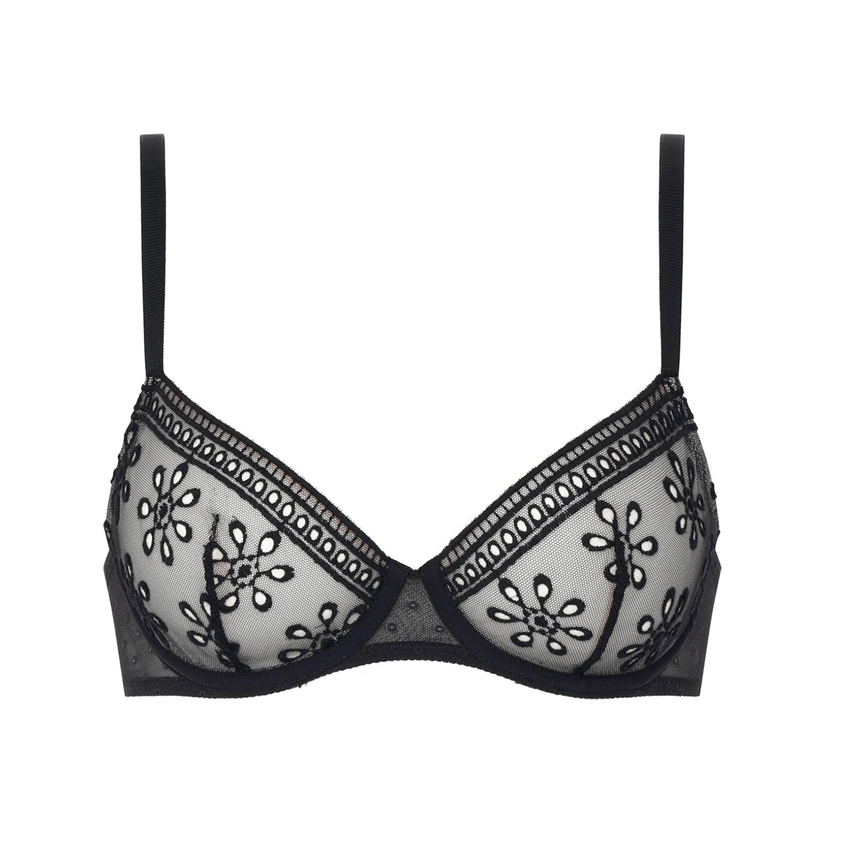 Класичний бюстгальтер з м'якою формою чашок на кісточках. Чашки виконані з розкішної та романтичної, непідвладної часу вишивки в стилі Рішельє; з внутрішньої сторони дубльовані тюлем для надання необхідної підтримки. Центральна та задні панелі виконані з ажурного тюлю. Регульовані бретелі.
