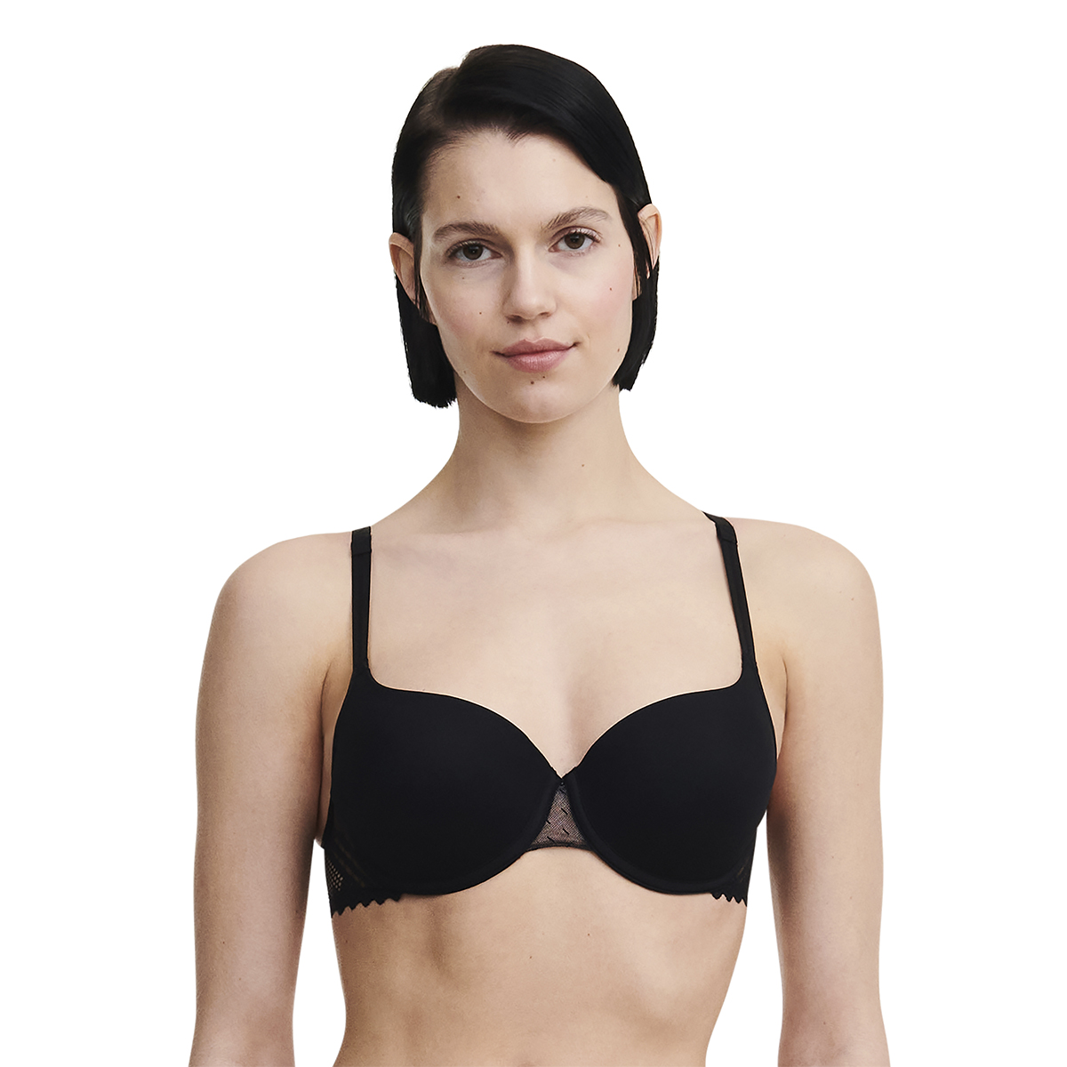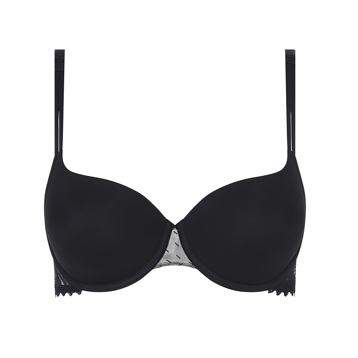 Бюстгальтер - формований зі злегка ущільненою гладкою формою чашок на кісточках. Чашки покриті гладкою безшовною мікрофіброю для максимальної невидимості під одягом. Бічні панелі – з мережива з графічним орнаментом. Регульовані бретелі.