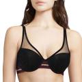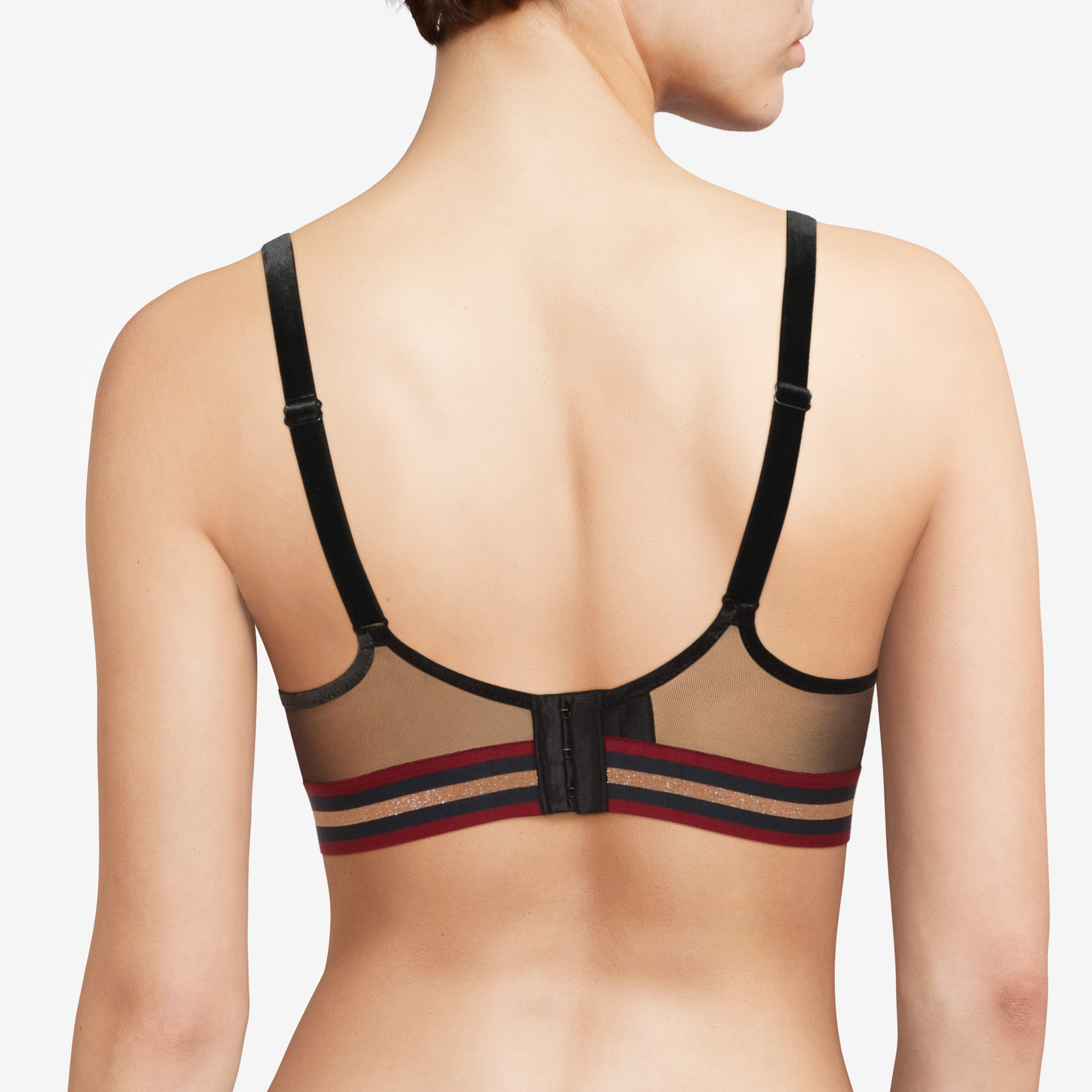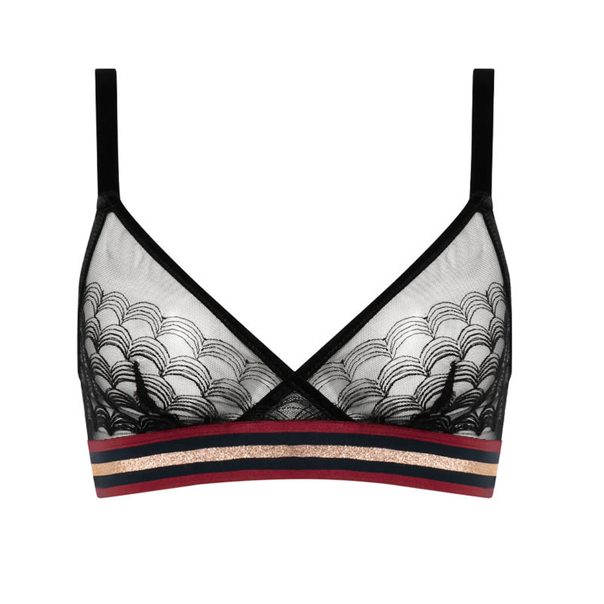 Бюстгальтер з м'якою трикутною формою без кісточок. Чашки виконані з тюлю та декоровані вишивкою. Основа бюстгальтера – широка еластична гумка у спортивному стилі. Оксамитове оздоблення і бретелі, що регулюються. Балетна спинка.