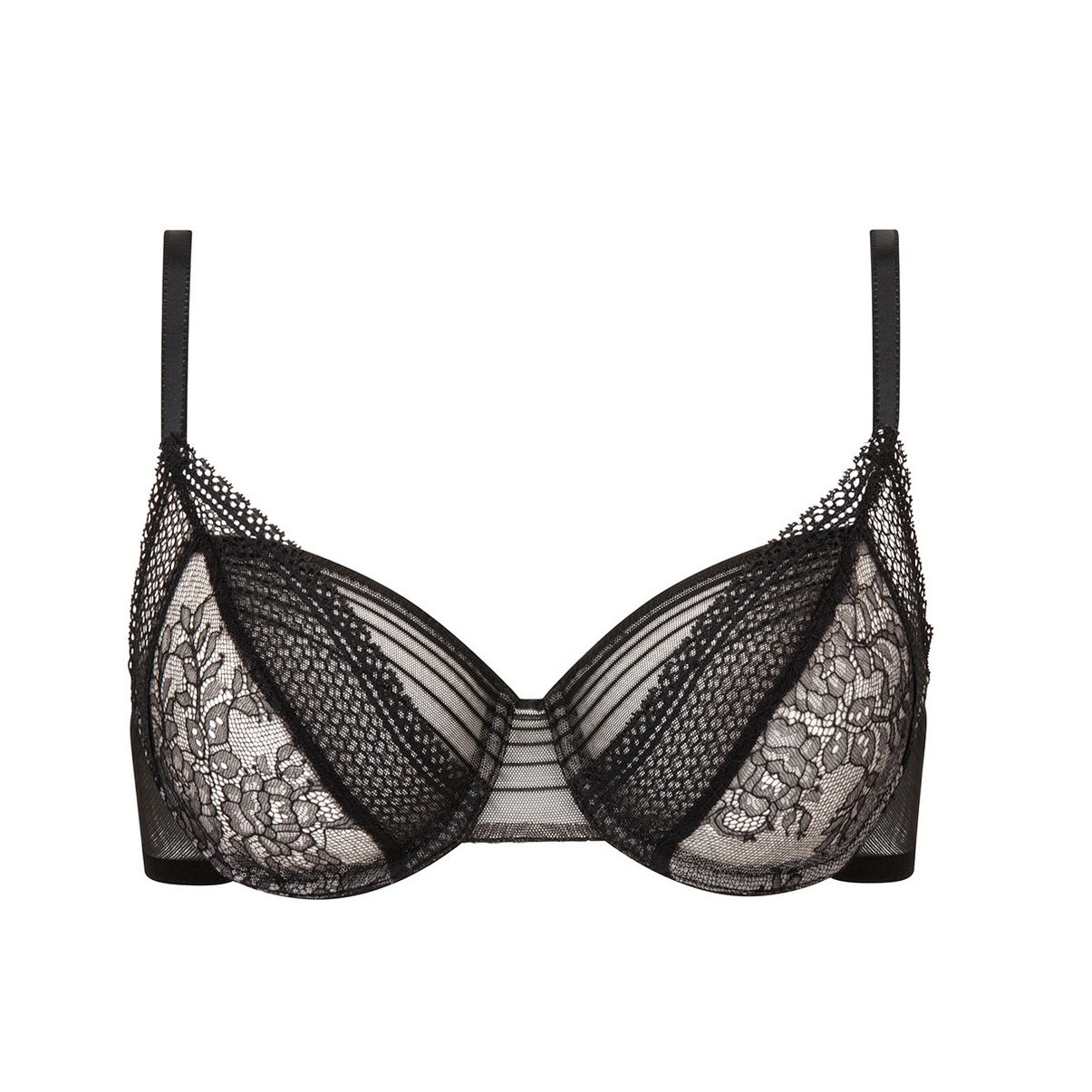 Бюстгальтер-балконет з м'якою формою чашок на кісточках. Чашки виконані мережива з квітковим орнаментом, з внутрішньої сторони дубльовані тюлем для надання необхідної підтримки. Область декольте доповнена мереживною тасьмою. Декоровані бретелі регулюються. Бічні панелі виконані із сітки.