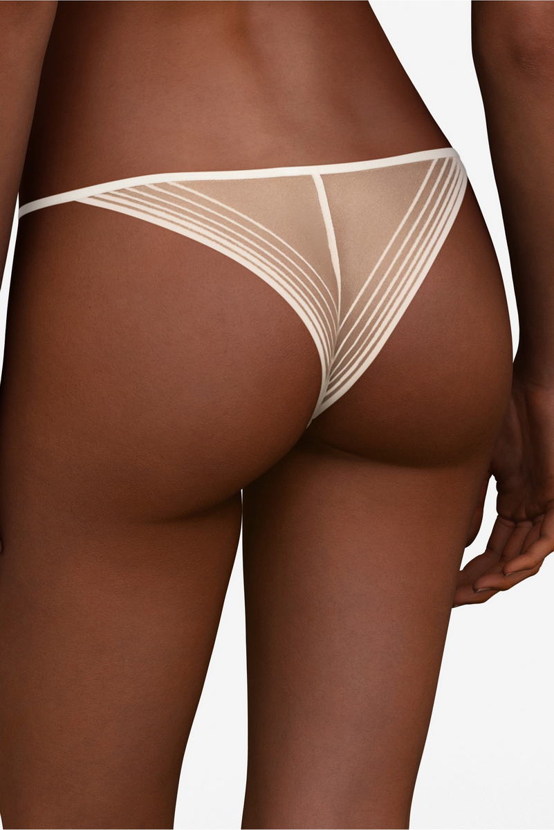 Труси-стрінги із заниженою посадкою. Передня панель виготовлена з мережив,; доповнена декоративною тасьмою та "крапелькою", задня - з прозорої сітки.