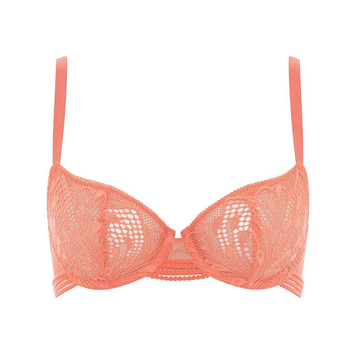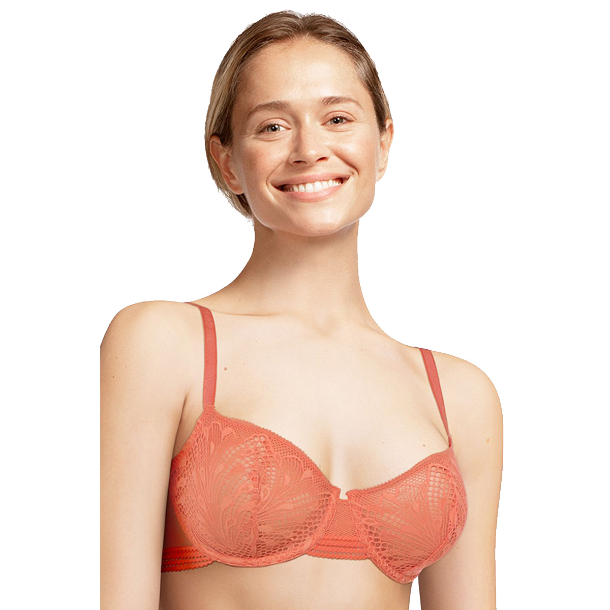 Бюстгальтер - балконет з м'якою, досить відкритою формою чашок на кісточках. Чашки виконані з гіпюру з квітковим орнаментом та з внутрішнього боку дубльовані тюлем. Основа бюстгальтера та бічні панелі виконані з еластичної сітки. Область декольте доповнена декоративними зубчиками. Регульовані бретелі.