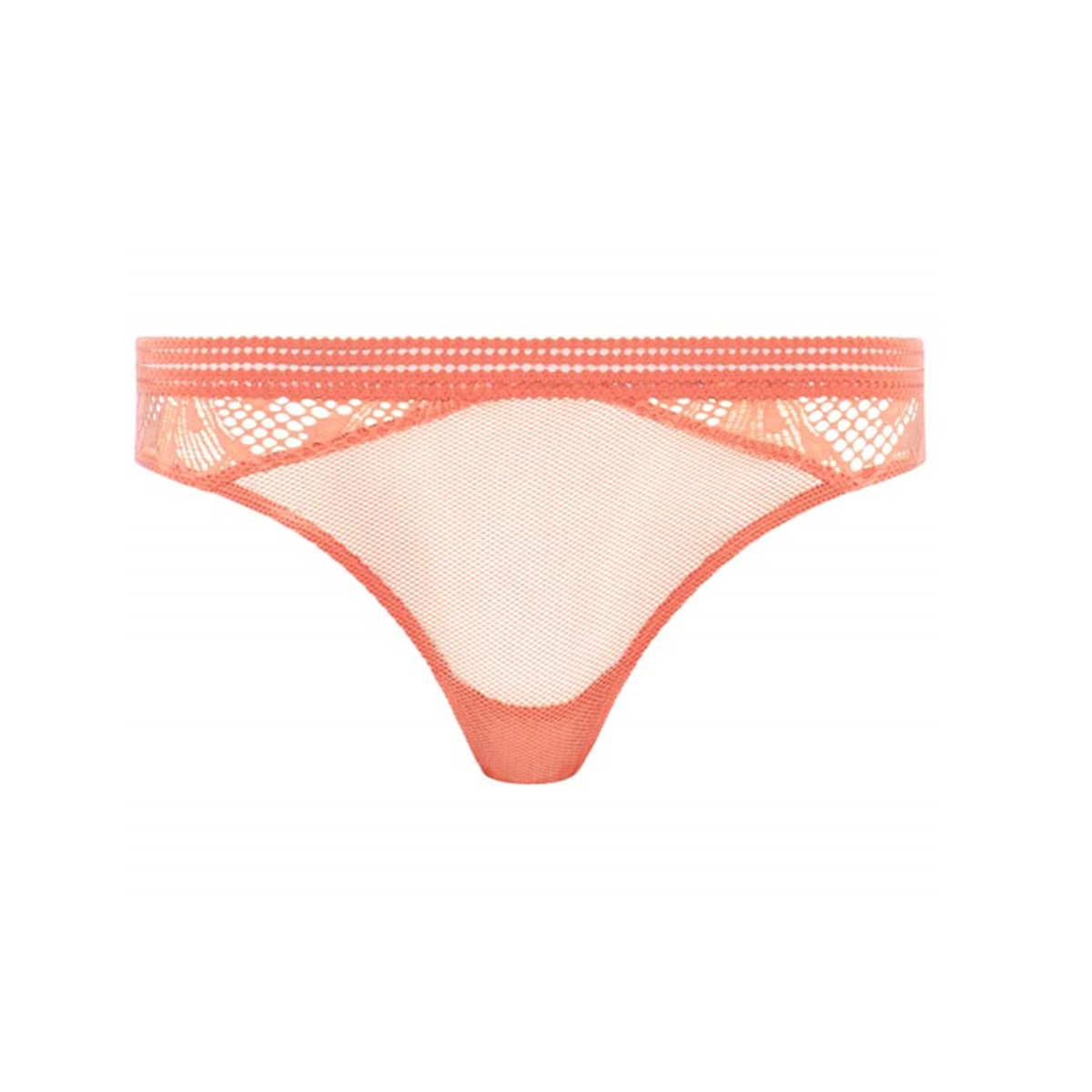 Труси-стрінги із середньо-заниженою посадкою. Передня панель виконана з еластичної напівпрозорої сітки, бічні та задня панелі – з вишуканого гіпюру з квітковим орнаментом.