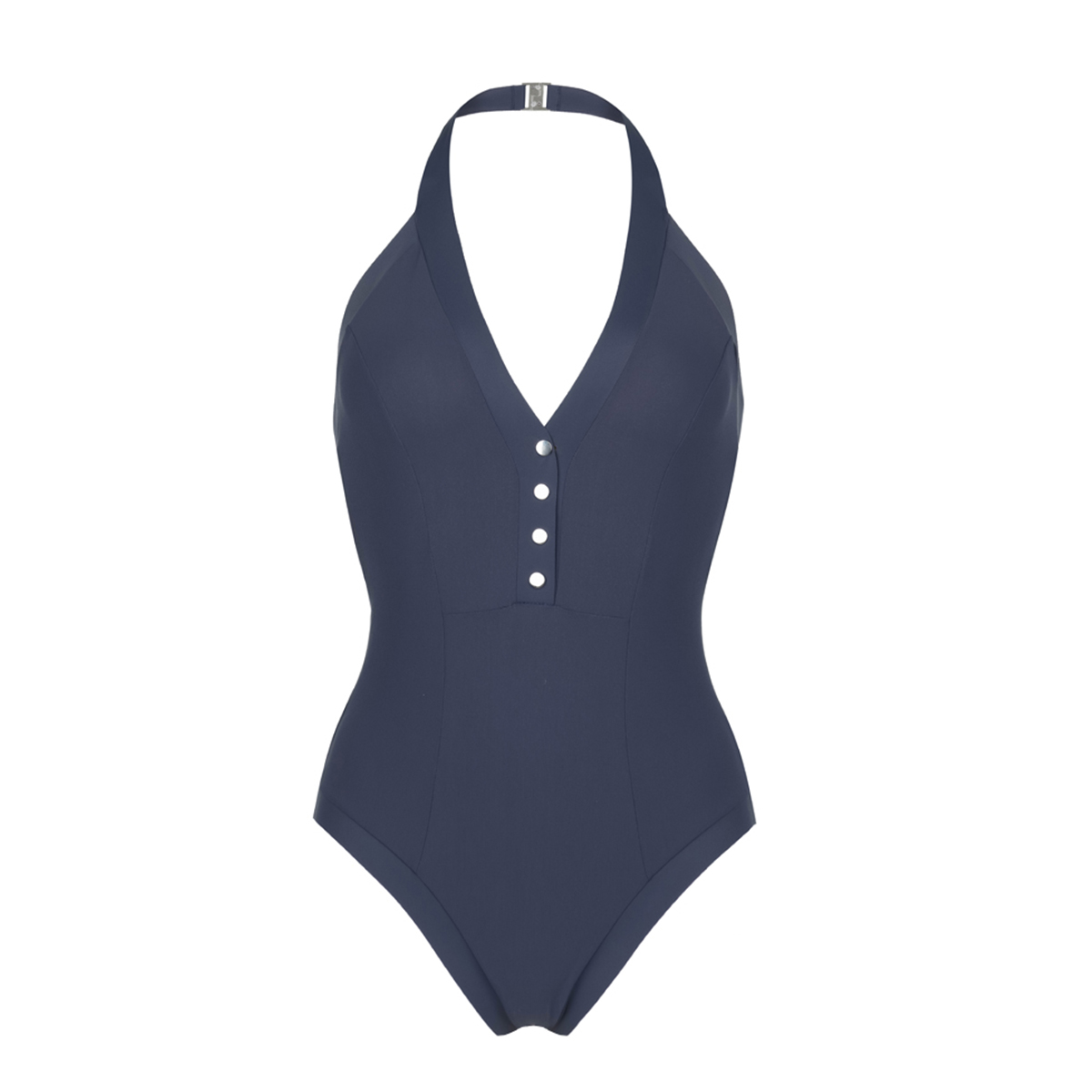 Цільний купальник без кісточок з трикутною формою чашок. Ґудзики на передній панелі дозволяють регулювати глибину Вашого декольте. Шви на передній та задній панелі структурують силует, створюючи ще ефектніший гламурний образ. Гола спина забезпечить повну свободу рухів. На шиї застібка-кліпса.