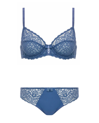 Синие оттенки могут быть капризными, поэтому здесь важно угадать с цветовым нюансом. К приглушенно-синему комплекту от DIM замечательно подойдут «родные» в белом и голубом оттенках, а также трусики от Passionata. Кажется, они созданы, чтобы быть вместе.