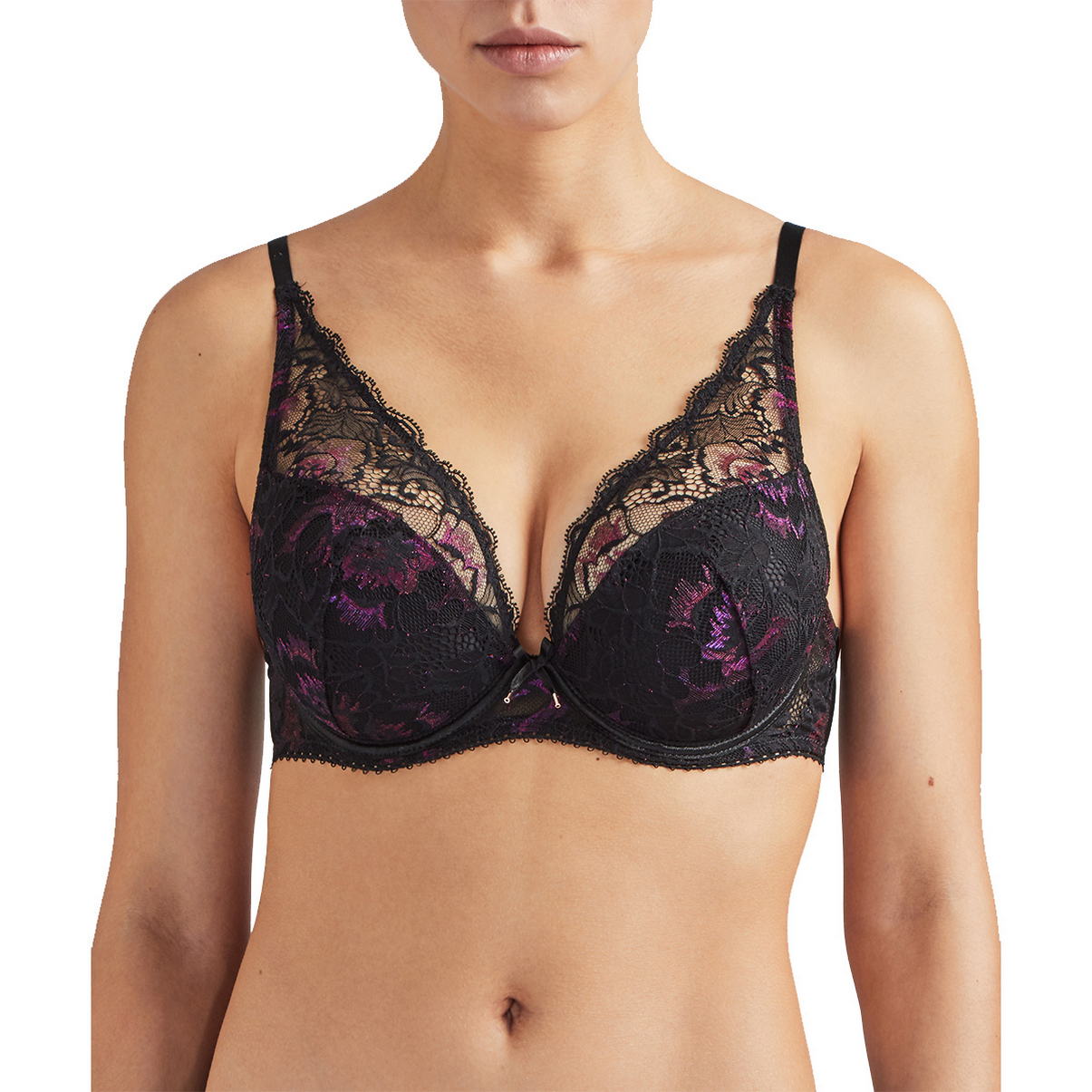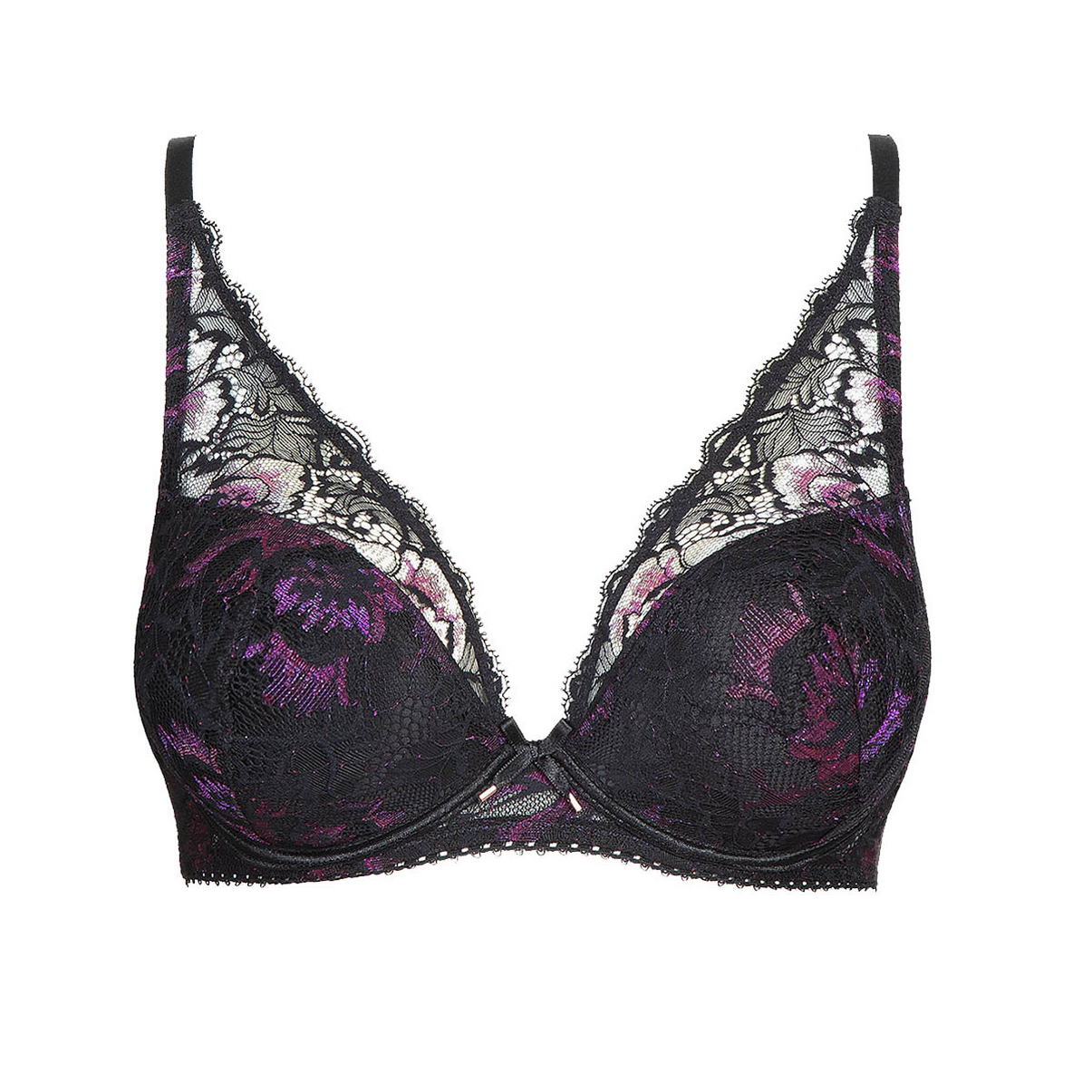 Бюстгальтер - пуш ап с уплотненной формой чашек с прослойкой из мусса для придания визуально дополнительного объема. Чашки покрыты трех-цветным кружевом, которе плавно перетекает в бретели. Область декольте дополнена декоративными зубчиками, на центральной панели - атласный бантик. Регулирующиеся бретели.