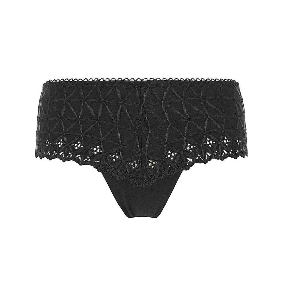 Трусы-боксеры со средне-заниженной посадкой. Передняя и задняя панели, практически полностью, выполнены из мягкого непрозрачного хлопка с Broderie Anglaise, что в переводе означает "английская вышивка" (Broderie Anglaise - это техника, которая сочетает в себе элементы вышивки и, так называемого, игольного кружева - обработанные ниткой отверстия в ткани.) . Верхний край дополнен декоративными зубчиками, а задняя - кокетливой шнуровкой.