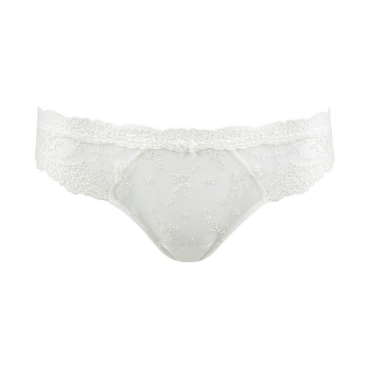 Трусы - стринги со средне-заниженной посадкой. Передняя панель выполнена из расшитого тюля, по-верхнему и нижнему краям декорирована кружевной тесьмой. Задняя панель - из тюля декорирована кружевной тесьмой.