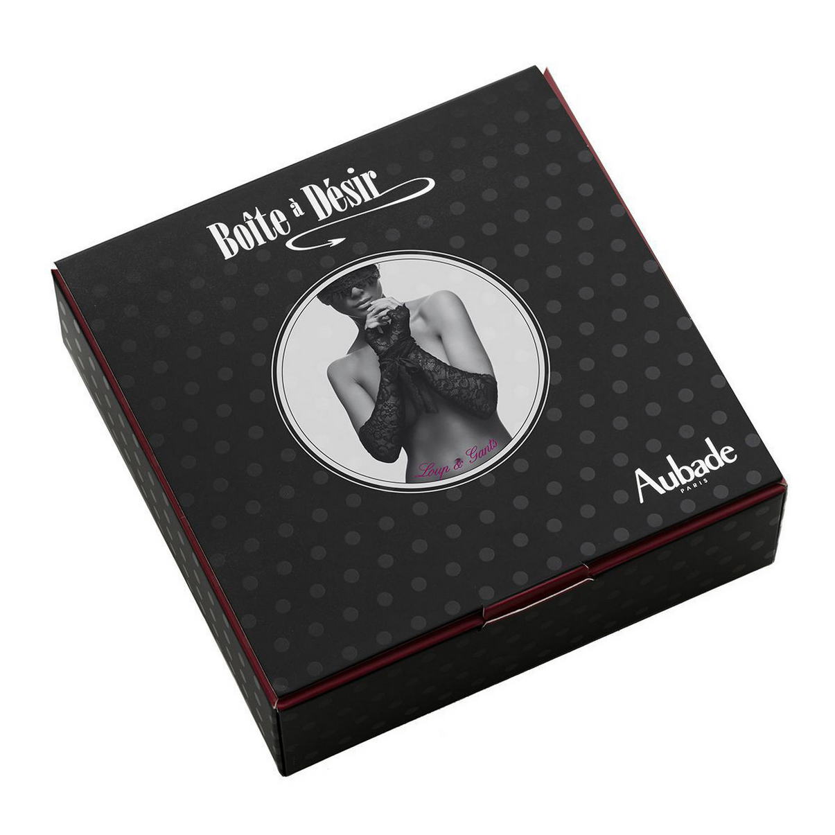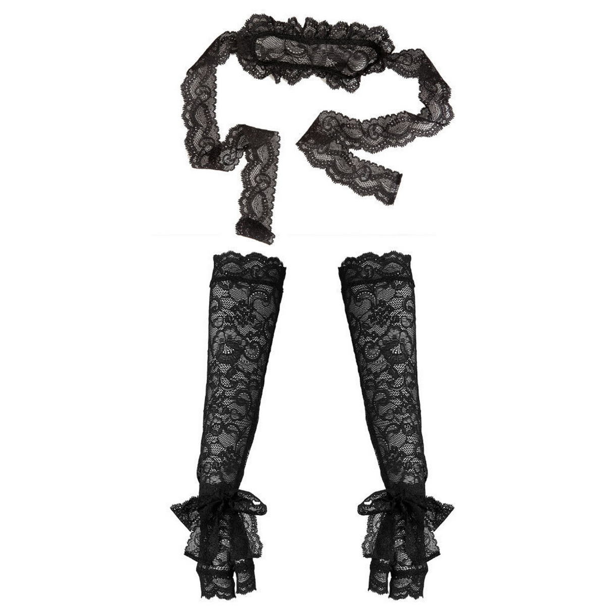 Длинные кружевные перчатки с петелькой, в которую можно протянуть ленту - для связывания и развязывания. Маска для глаз - из прозрачного кружева на завязывающихся лентах. Все модели представлены отдельно, в индивидуальной подарочной коробочке с изображением изделия в круглом окошке.