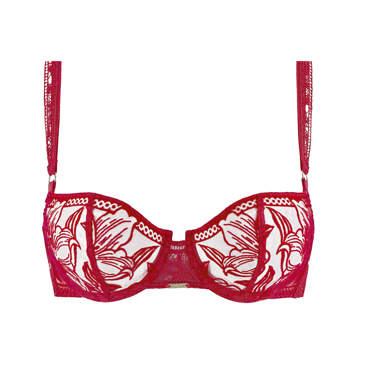 Бюстгальтер - балконет с мягкой, достаточно, открытой формой чашек на косточках. Чашки бюстгальтера выполнены из тюля с вышивкой с бархатным напылением. Центральная и боковые панели дополнены вставками из гипюра. Регулирующиеся бретели выполнены из неэластичного гипюра и дополнены металлическими кольцами.