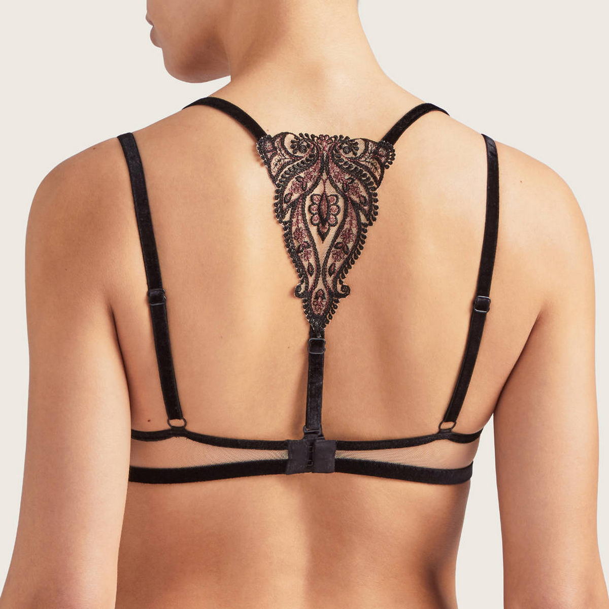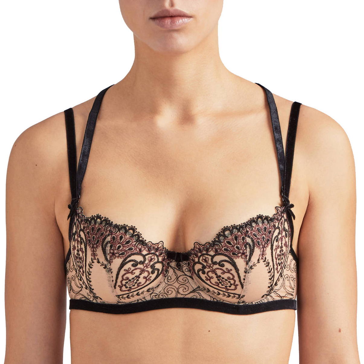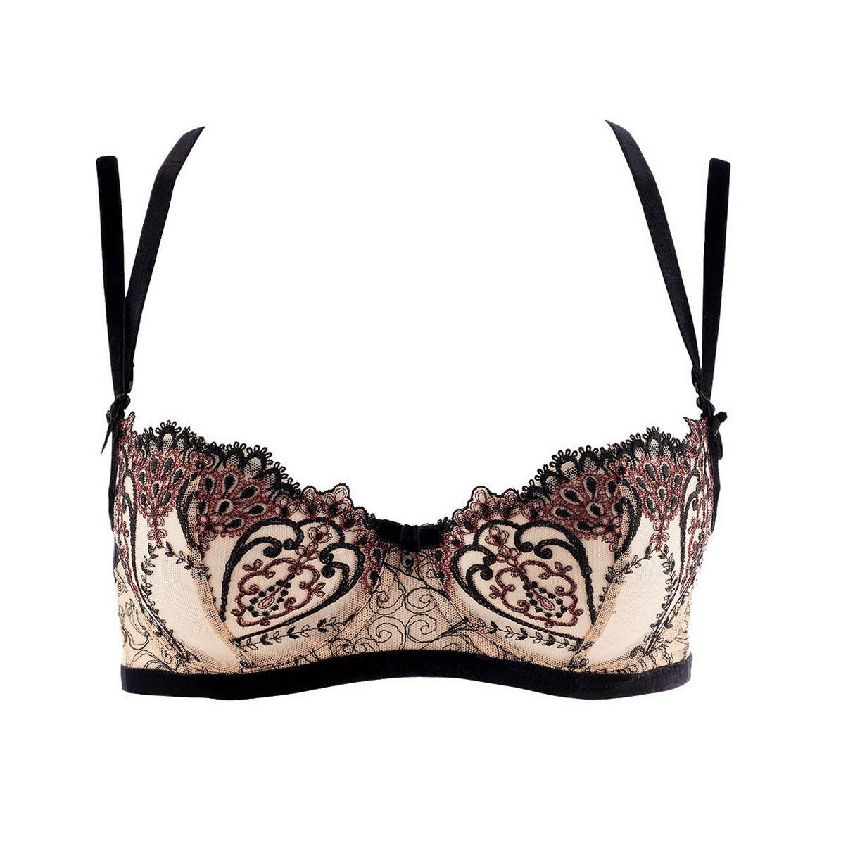 Бюстгальтер - балконет с мягкой, открытой формой чашек на косточках. Чашки выполнены из тюля с контрастной вышивкой с орнаментом арабеска, которая дополнена люрексовой бордовой нитью (Арабеска (итал. arabesco, укр. арабский) — европейское название сложного восточного средневекового орнамента, который складывается из геометрических и растительных элементов). Область декольте дополнена декоративными зубчиками. Основа бюстгальтера и бретели - из бархата, на центральной панели разместился бархатный бантик с маленькой бусиной. На спине - съемная декоративная деталь. Регулирующиеся бретели.