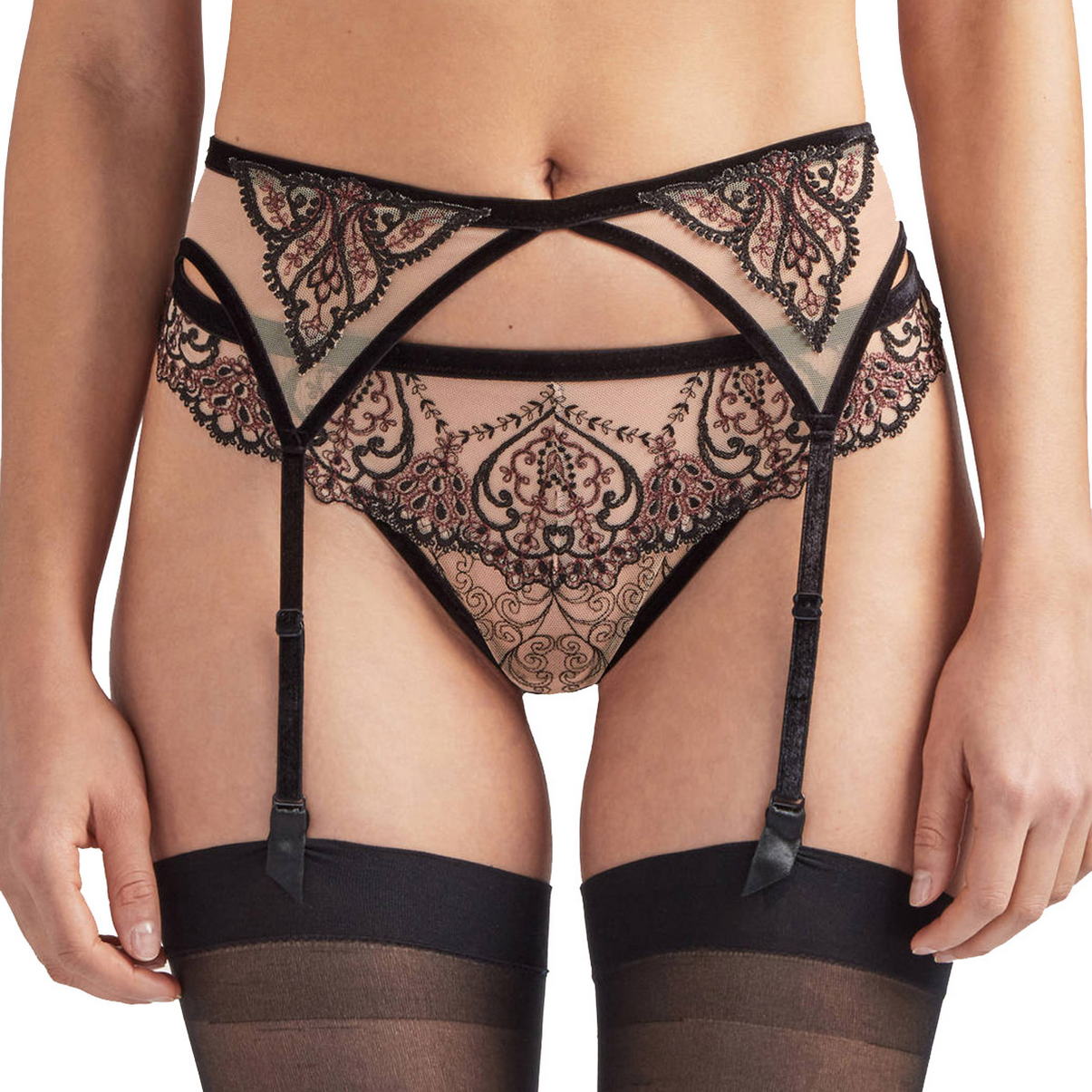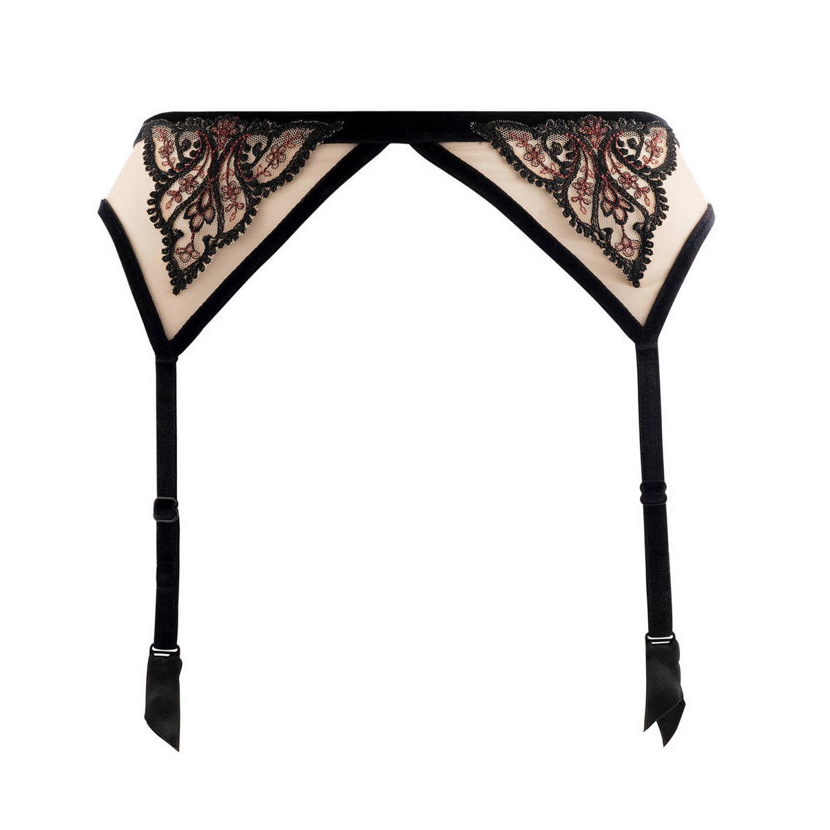 Пояс для чулок с регулирующимися бархатными подтяжками. Выполнен из тюля с контрастной вышивкой с орнаментом арабеска, которая дополнена люрексовой бордовой нитью (Арабеска (итал. arabesco, укр. арабский) — европейское название сложного восточного средневекового орнамента, который складывается из геометрических и растительных элементов). Декорирован бархатом. Застежка - на задней панели на один крючек.