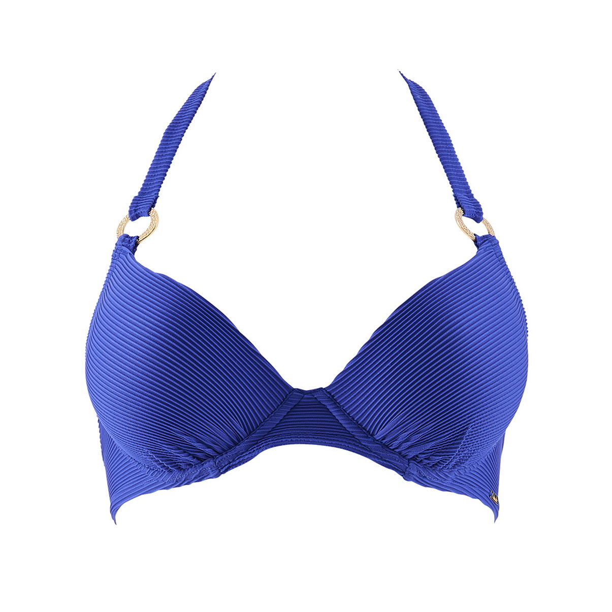 Бюстгальтер-пуш ап с плотной формой чашек с интегрированными подушками (для придания визуально дополнительного объема). Чашки и бретели соединены между собой "золотистыми" кольцами. Бретели завязваются вокруг шеи; застежка сзади.