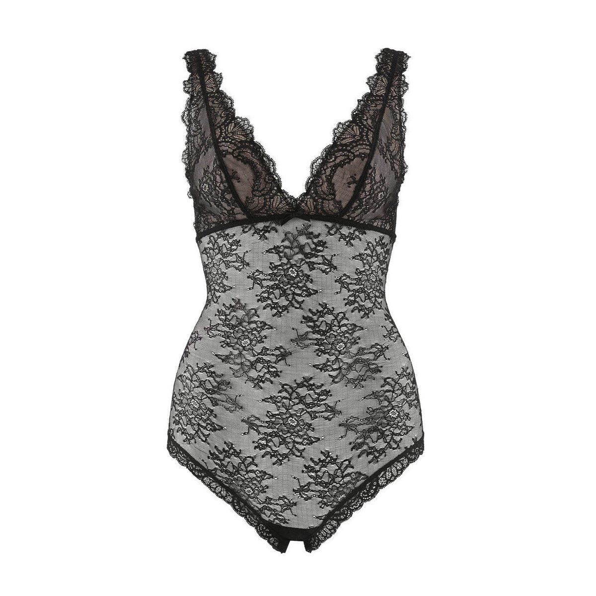 Боди с мягкой треугольной формой чашек без косточек. Полностью выполнен из кружева с цветочным орнаментом. Чашки с внутренней стороны дублированы тюлем для придания необходимой поддеркжи. Глубокое, V-образной формы, декольте дополнено декоративными зубчиками. Задняя панель - в форме классических трусов. Бретели - не регулируются. Застежка - на крючках между ног.