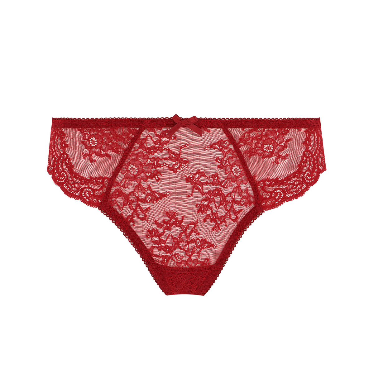 Трусы-стринги с заниженной посадкой полностью выполнены из кружева с цветочным орнаментом. Верхний край дополнен декоративными зубчиками. На передней и задней панелях разместился деликатный бантик.
