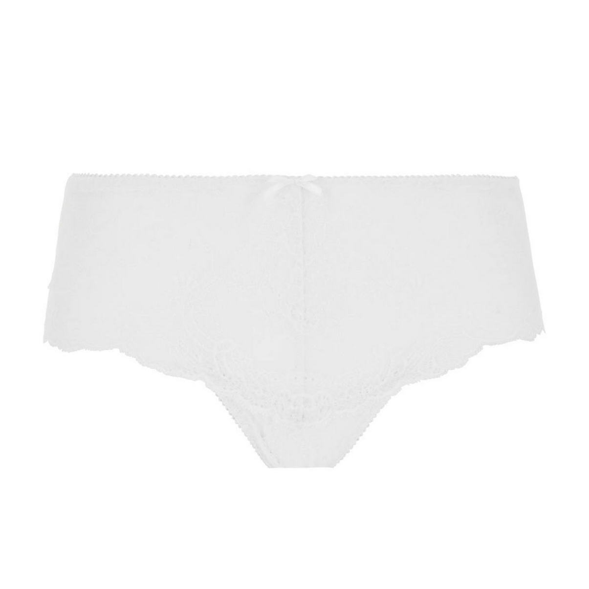 Трусы-боксеры со средне-заниженной посадкой полностью выполнены из кружева с цветочным орнаментом. Верхний край дополнен декоративными зубчиками. На передней и задней панелях разместился деликатный бантик.