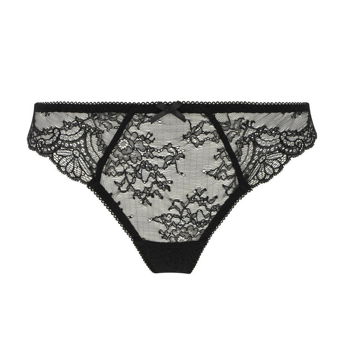 Трусы-стринги с заниженной посадкой полностью выполнены из кружева с цветочным орнаментом. Верхний край дополнен декоративными зубчиками. На передней и задней панелях разместился деликатный бантик.