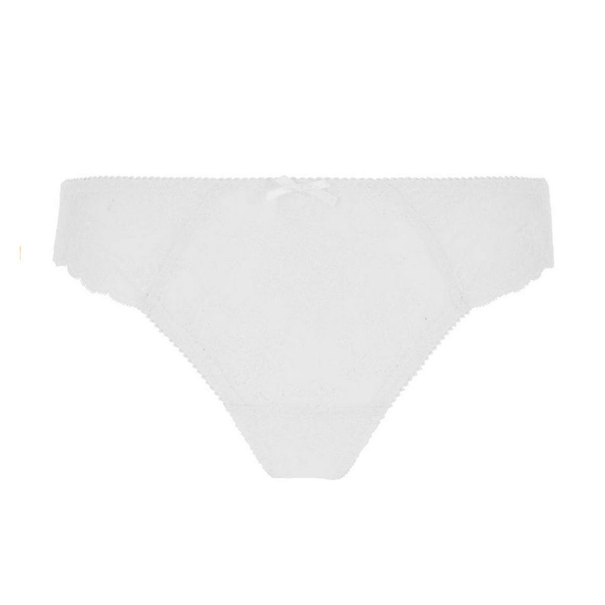 Трусы-стринги с заниженной посадкой полностью выполнены из кружева с цветочным орнаментом. Верхний край дополнен декоративными зубчиками. На передней и задней панелях разместился деликатный бантик.