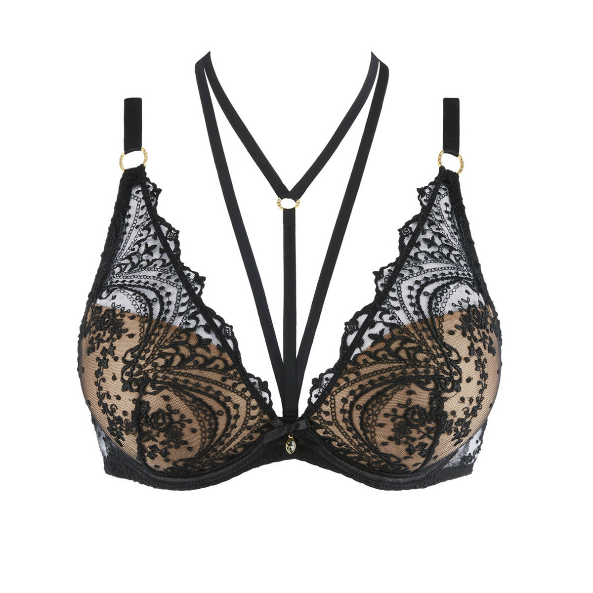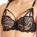 Бюстгальтер - пуш ап с уплотненной формой чашек с прослойкой из мусса для придания визуально дополнительного объема. Чашки покрыты прозрачным расшитым швейцарской вышивкой в стиле барокко тюлем, плавно переходящим в бретели. Регулирующиеся бретели декорированы золоыми кольцами. Область декольте дополняет съемная декоративная деталь. На центральной панели разместился бантик.