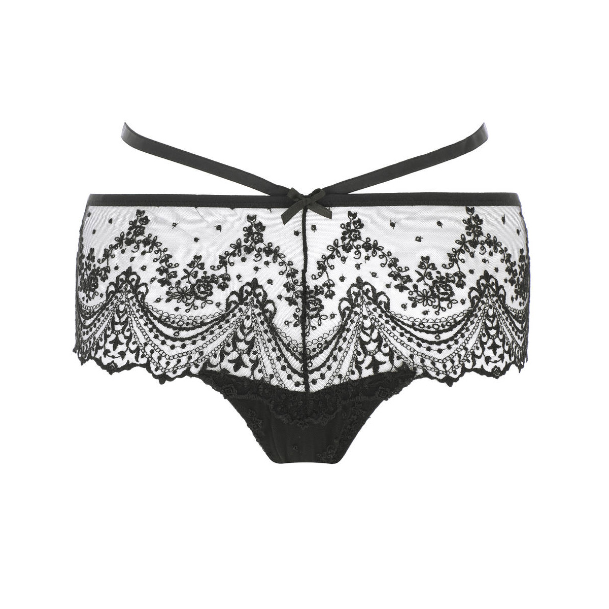 Трусы-боксеры со средне-заниженной посадкой. Полностью выполнены из прозрачного расшитого швейцарской вышивкой в стиле барокко. Задняя панель дополнена шнуровкой.