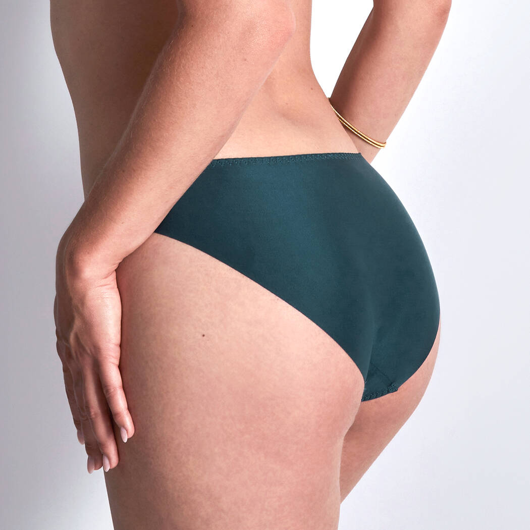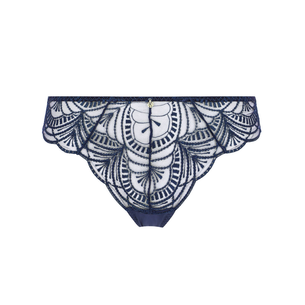 Трусы - классические со средне - заниженной посадкой. Передняя панель выполнена из расшитого этничными мотивами тюля, задняя - из эластичной микрофибры с необработанными краями. Передняя панел дополнена золотой деталью.