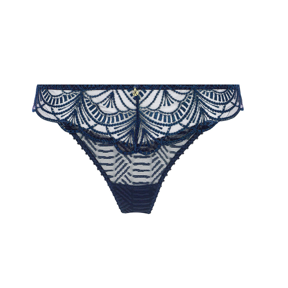 Трусы - стринги со средне - заниженной посадкой. Практически полностью, выполнены из эластиного тюля с графичным рисунком. Передня панель дополнена вставкой из расшитого этническими мотивами тюля и золотой деталью.