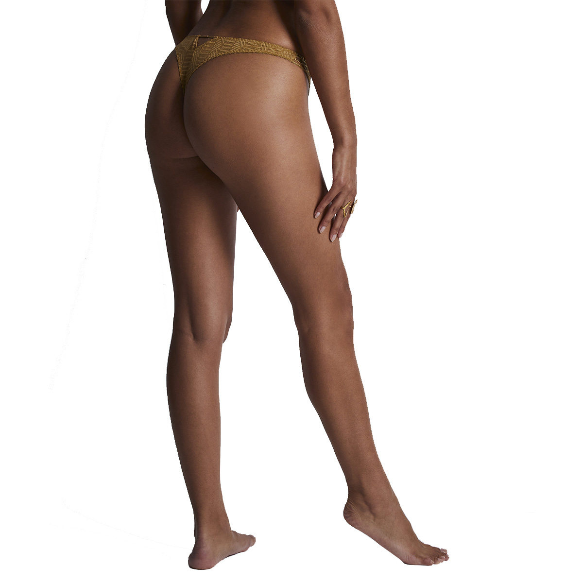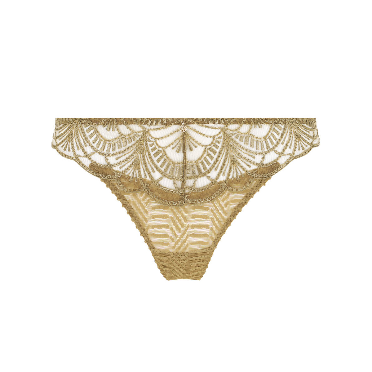 Трусы - стринги со средне - заниженной посадкой. Практически полностью, выполнены из эластиного тюля с графичным рисунком. Передня панель дополнена вставкой из расшитого этническими мотивами тюля и золотой деталью.