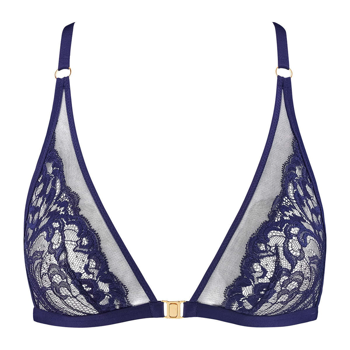 Бюстгальтер - бралет с мягкой треугольной формой чашек без косточек и застежкой из замака на передней панели. Выполнен из тюля с элегантным французским кружевом. "Американская" спинка с регулирующимися эластичными бретелями.