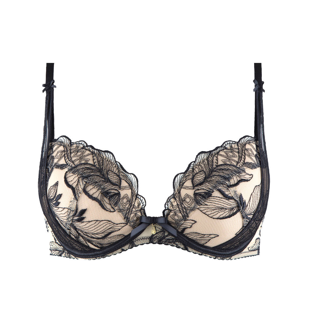 Бюстгальтер - пуш ап с уплотненной формой чашек с вынимающимися подушками, на косточках. Чашки покрыты расшитым цветочным орнаментом тюлем, который создает эффект тату на теле и подчеркивает роскошь вышивки. Регулирующиеся бретели. На центральной панели разместился бантик с небольшим украшением.