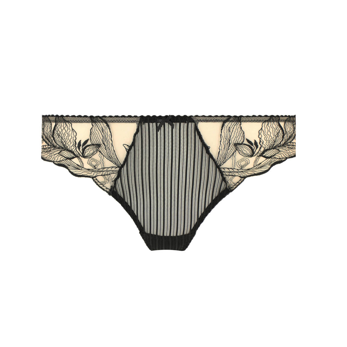 Трусы-стринги со средне-заниженной посадкой. Передняя панель выполнена из тюля и декорирована вставками с вышивкой по бокам. Задняя - из тюля с вышивкой.