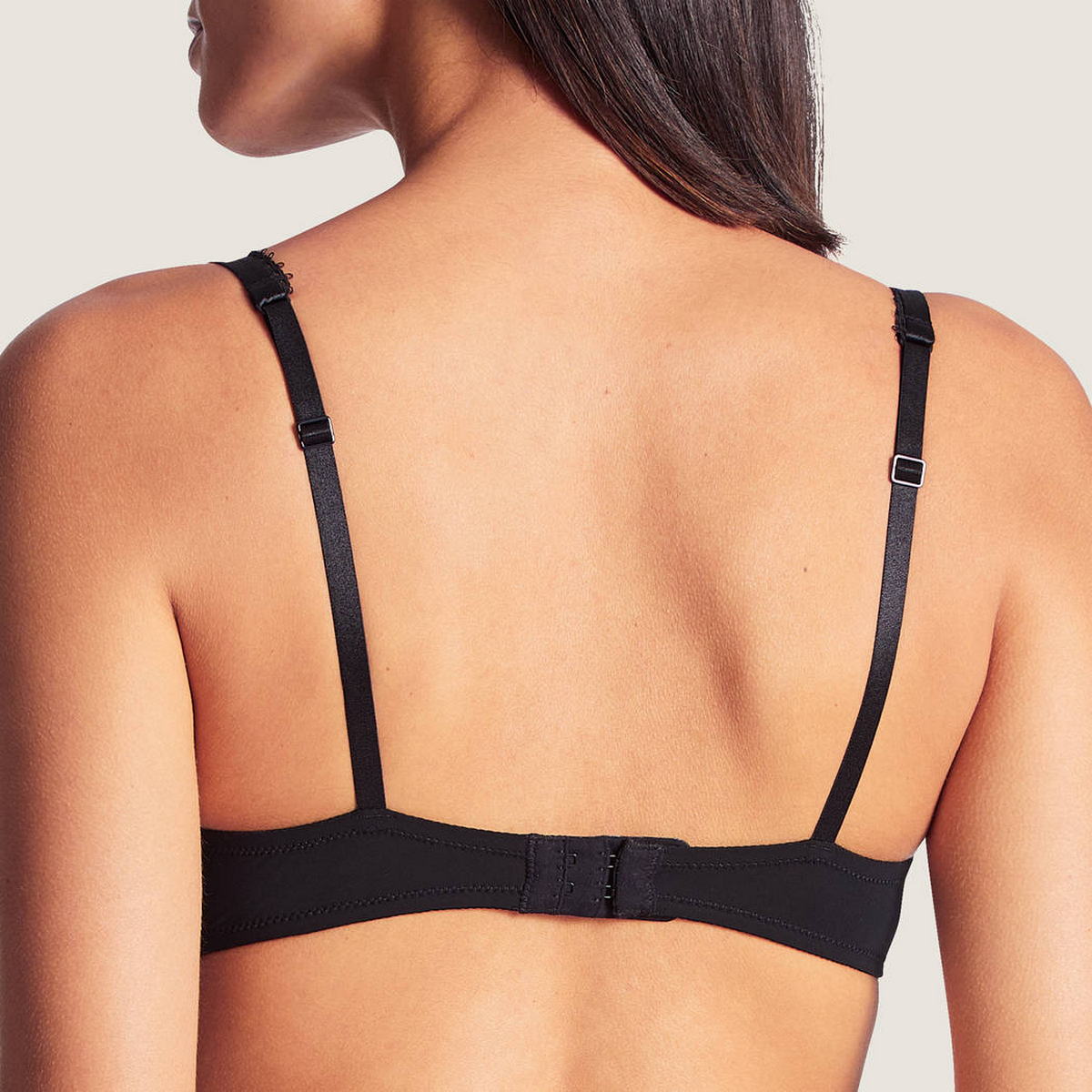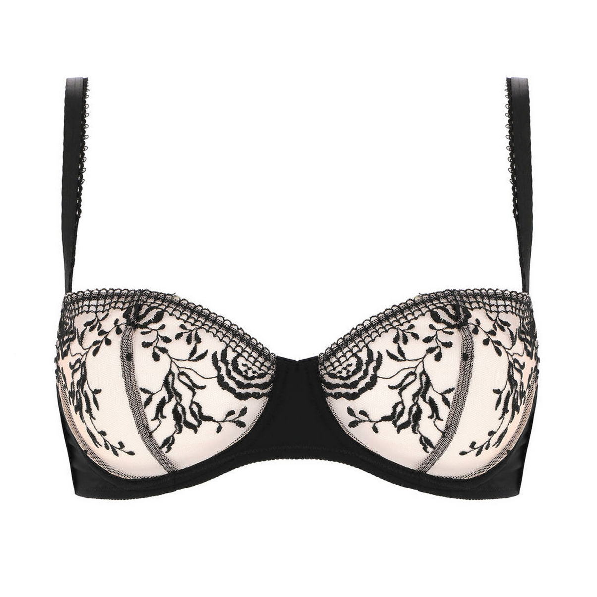 Бюстгальтер-балконет с мягкой открытой формой чашек на косточках. Чашки выполнены из тюля с цветочной вышивкой. Область декольте и бретели дополнены декоративными зубчиками. Основа бюстгальтера и бретели выполнены из микрофибры контратсного цвета. Регулирующиеся бретели.