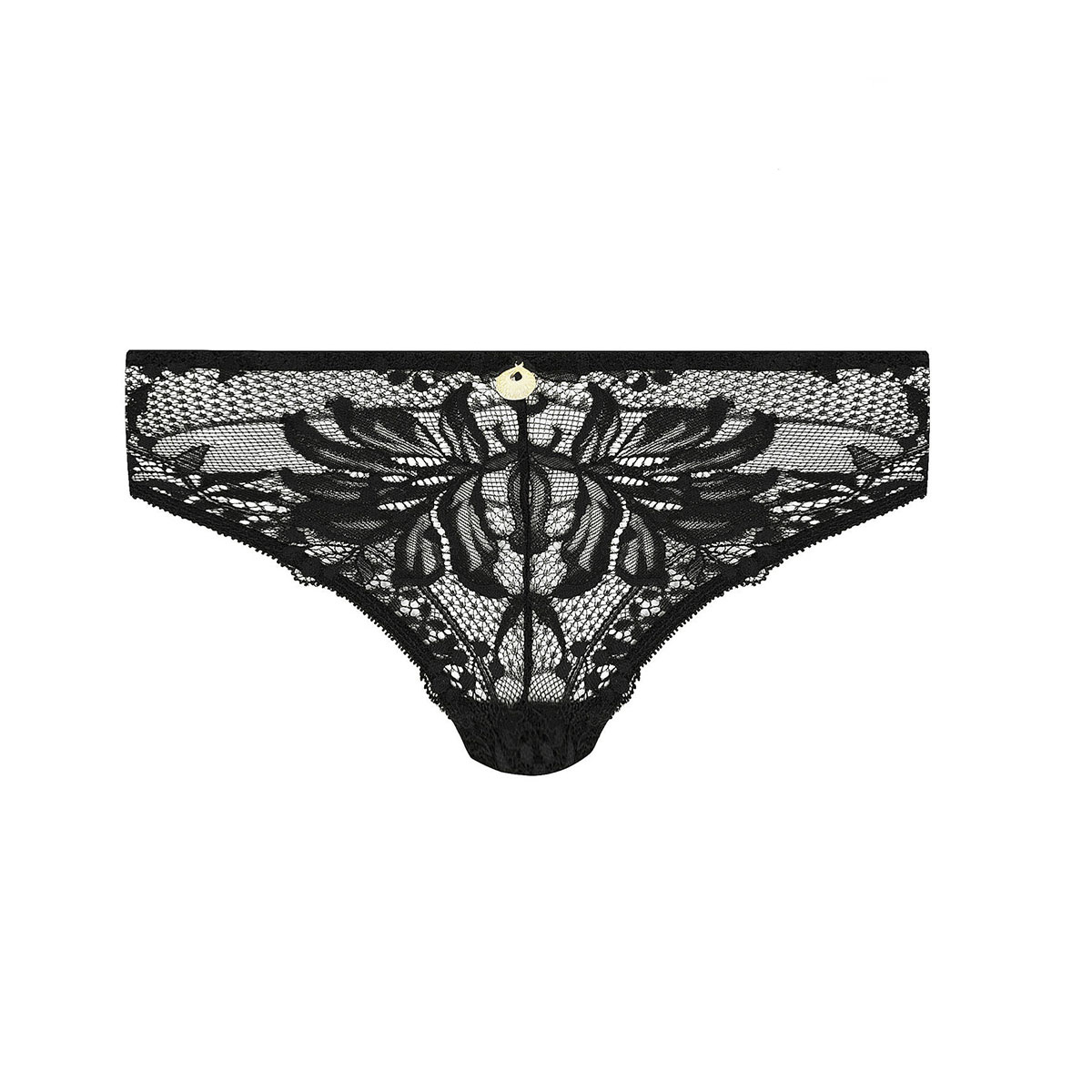 Трусы - бикини со средне - заниженной посадкой. Полностью выполнены из кружева с цветочным орнаментом. Передняя панель дополнена золотым украшением. Съемная золотая цепочка.