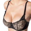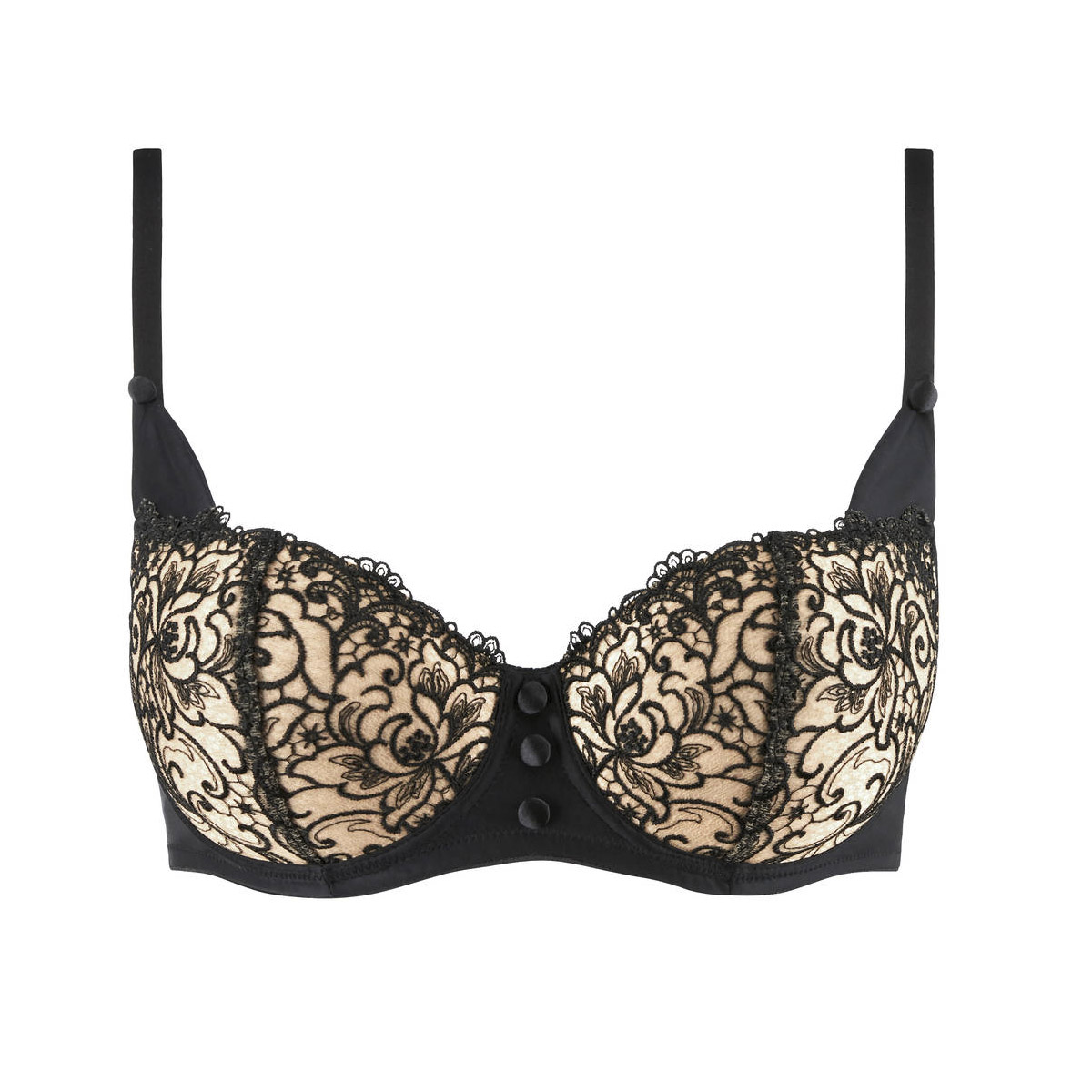 Бюстгальтер - формованный со слегка уплотненной формой чашек на косточках. Чашки покрыты вышивкой в стиле гипюр на паутинной основе из контрастного тюля. Область декольте дополнена декоративными зубчиками. Основа бюстгальтера и основания бретелей выполнены из атласа и дополнены деталями смокинга в виде атласных пуговок. Регулирующиеся бретели.