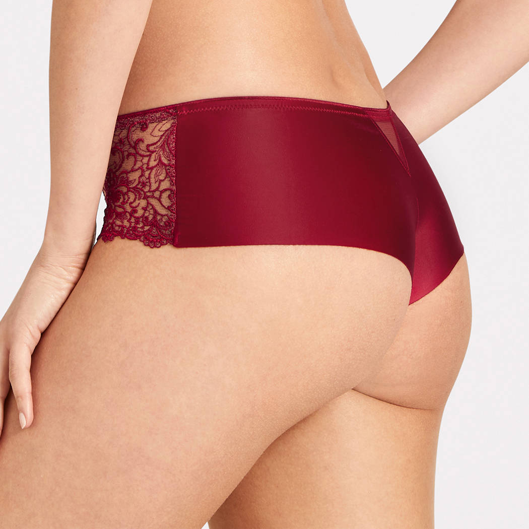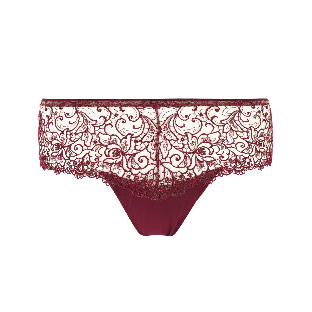 Трусы - боксеры со средне-заниженной посадкой. Передняя панель выполнена из вышивки в стиле гипюр на паутинной основе из контрастного тюля и дополнена деталью смокинга в виде атласной пуговки, задняя - из непозрачной микрофибры с необработанными краями.