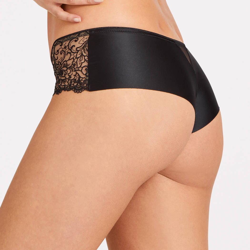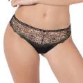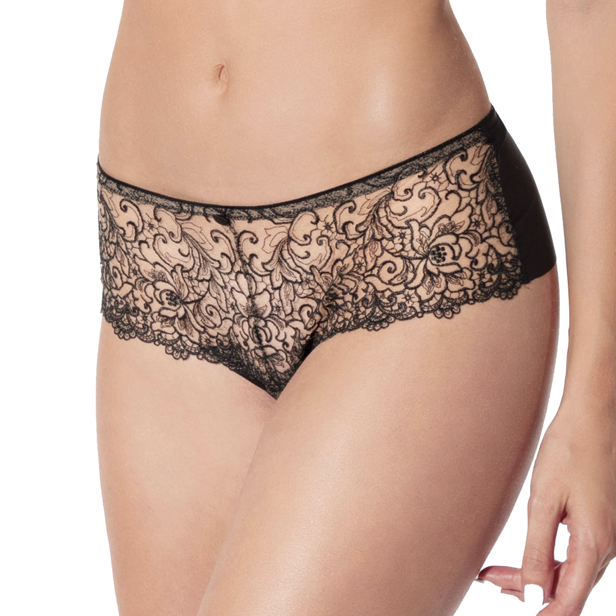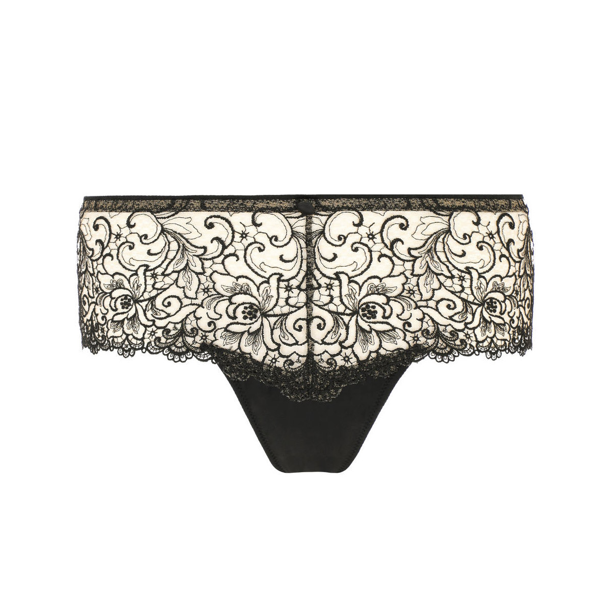 Трусы - боксеры со средне-заниженной посадкой. Передняя панель выполнена из вышивки в стиле гипюр на паутинной основе из контрастного тюля и дополнена деталью смокинга в виде атласной пуговки, задняя - из непозрачной микрофибры с необработанными краями.