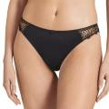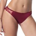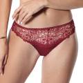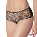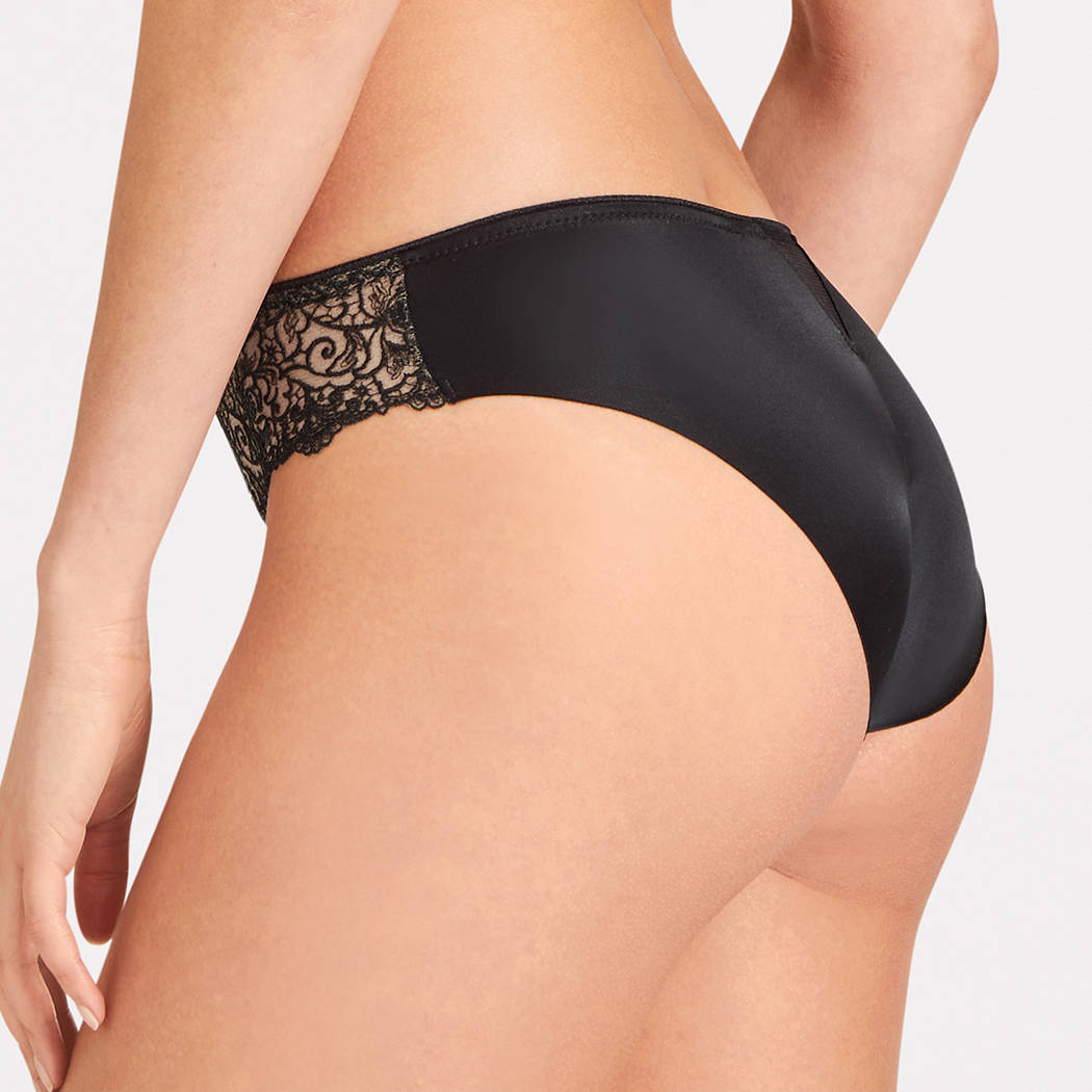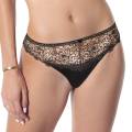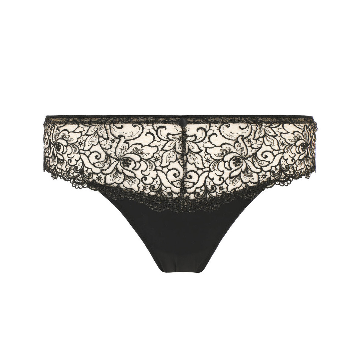 Трусы - классические со средне-заниженной посадкой. Передняя панель выполнена из непрозрачной микрофибры и вышивки в стиле гипюр на паутинной основе из контрастного тюля; дополнена деталью смокинга в виде атласной пуговки. Задняя панель - из непрозрачной атласной микрофибры с необработанными краями; дополнена геометричной вставкой из тюля.