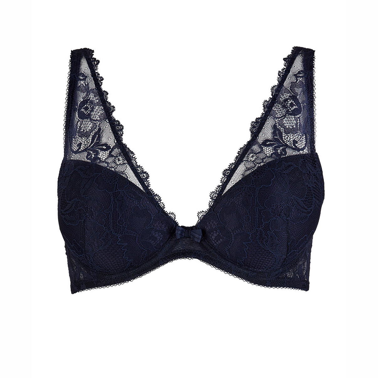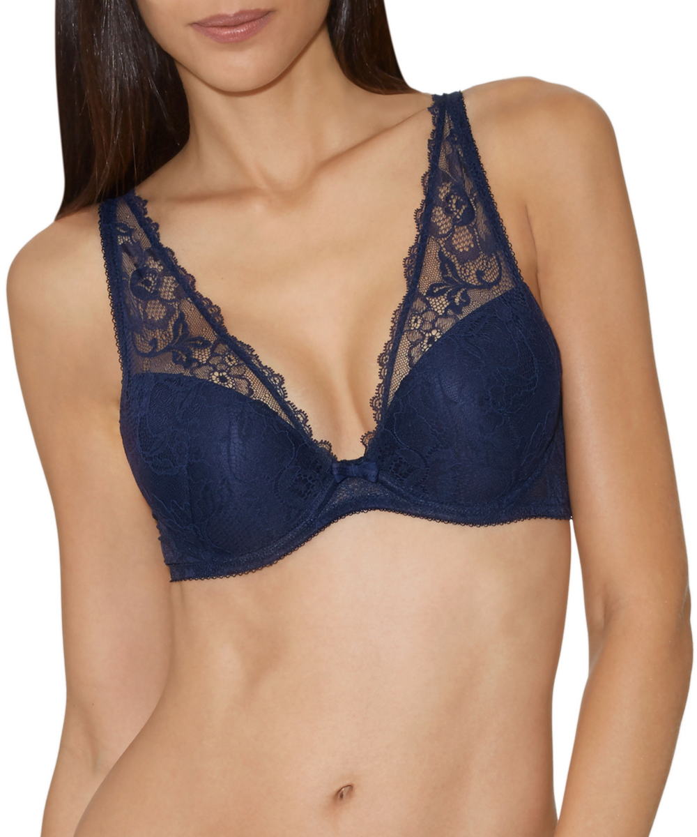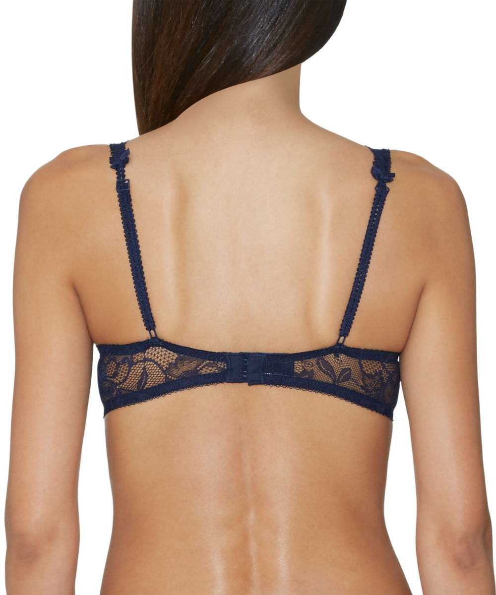 Бюстгальтер - пуш ап с плотной формой чашек, выполненных из толстого слоя мусса, на косточках; чашки покрыты кружевом с цветочным орнаментом, которое плавно перетекает в бретели; глубокое декольте; на центральной панели маленький бантик; Задняя панель выполнена из кружева.