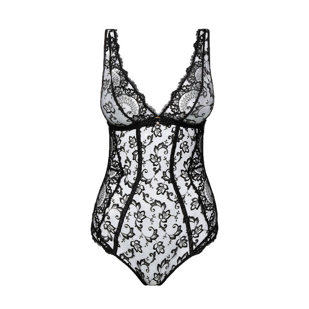 Боди с мягкой треугольной формой чашек без косточек. Выполнен из роскошного кружева с цветочным орнаментом. На центральной панели - декоративная деталь. Область декольте дополнена декоративными зубчиками. Регулирующиеся бретели. Задняя часть бретелей - из трех частей, которые сливаются воедино при помощи золотых колец.