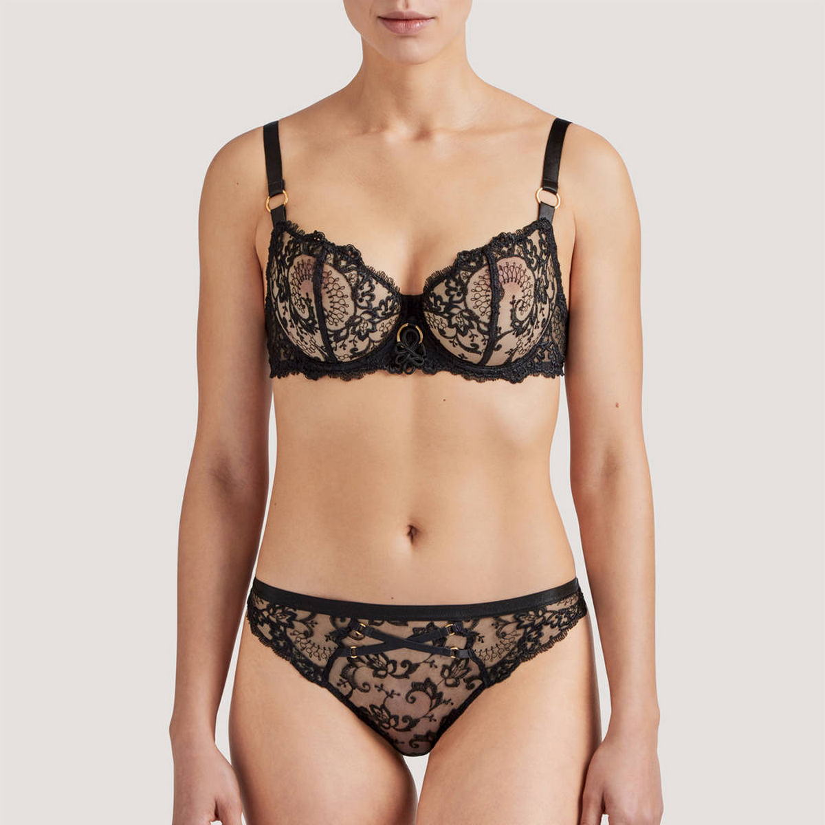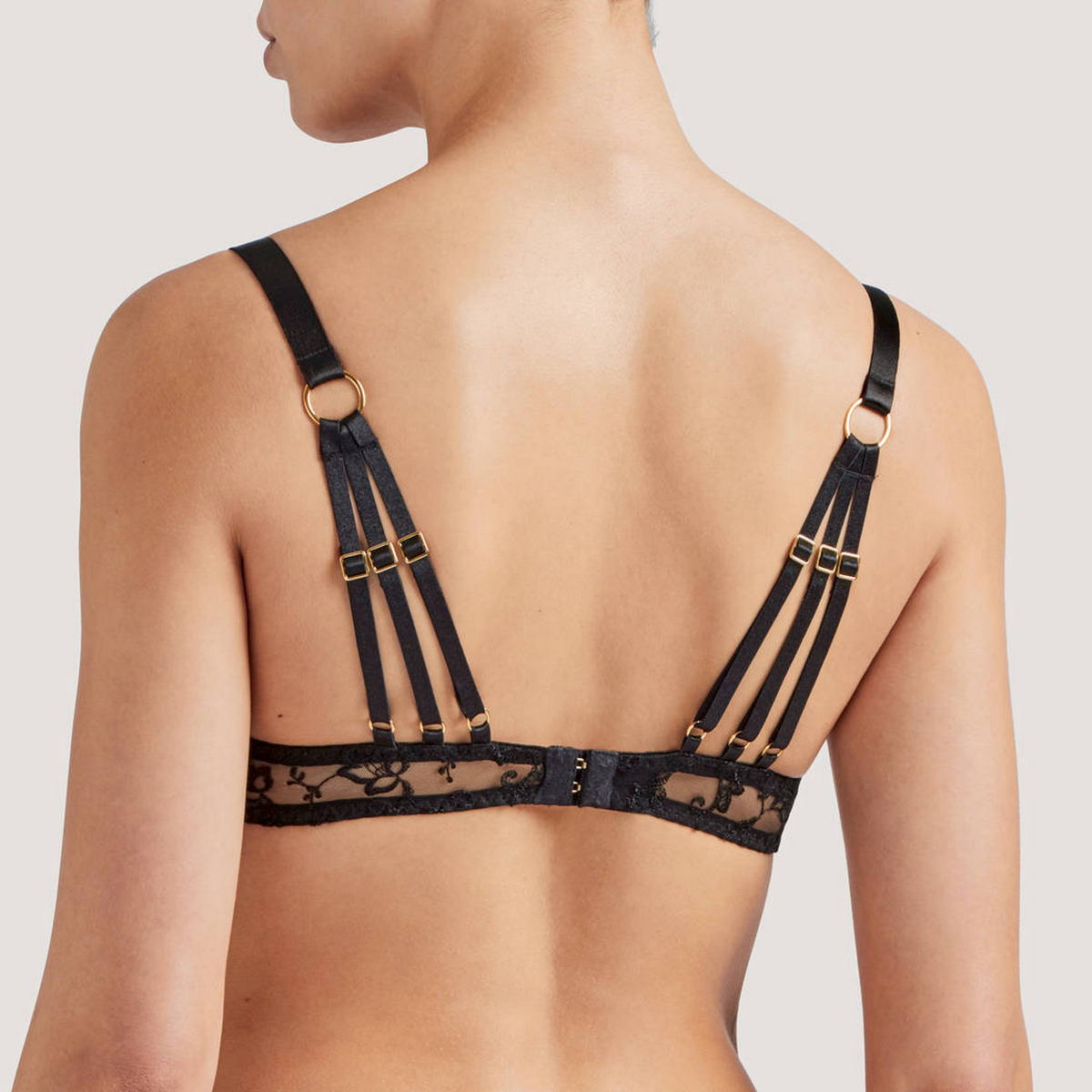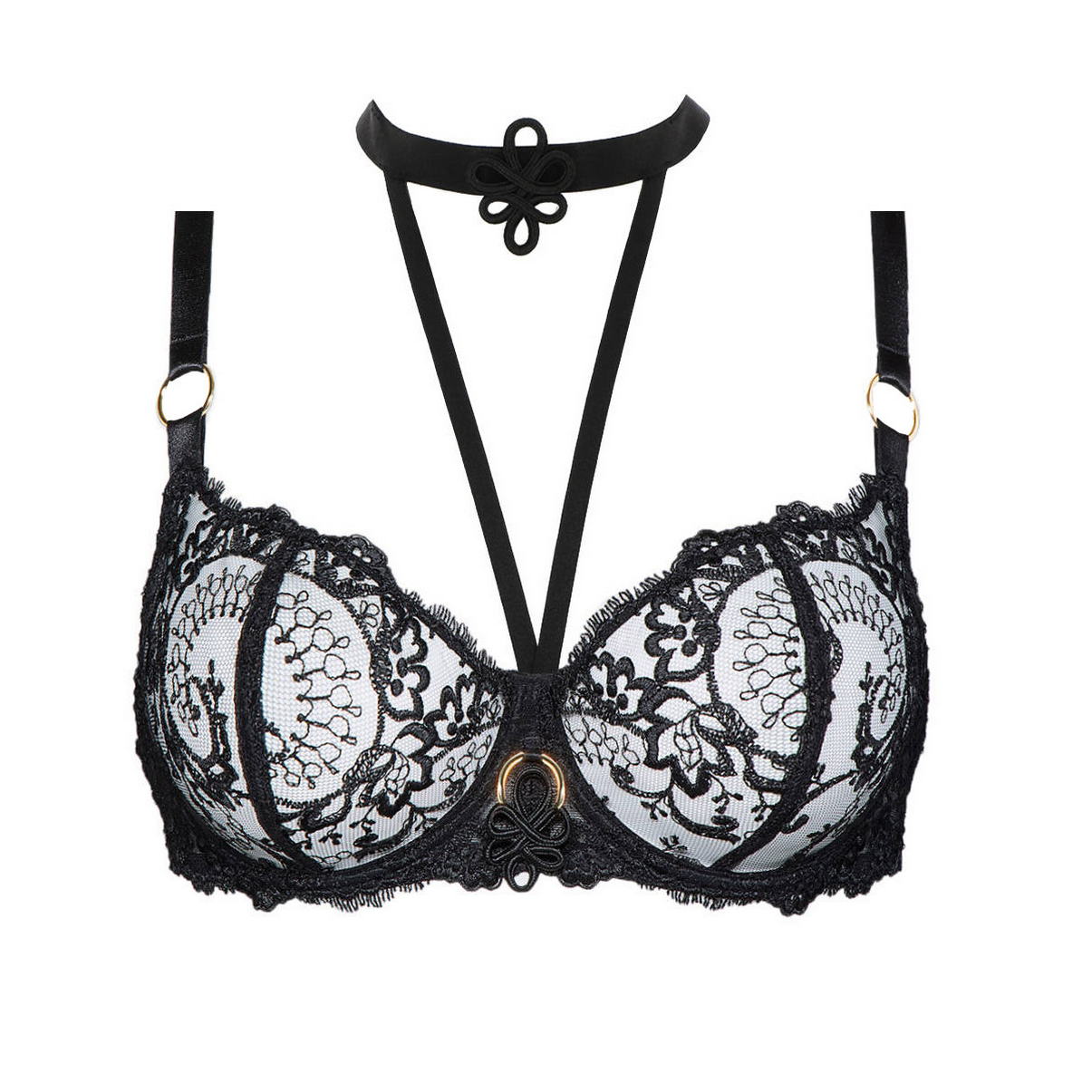 Бюстгальтер - балконет с мягкой, открытой формой чашек на косточках. Чашки выполнены из роскошного кружева с цветочным орнаментом. Центральная панель дополнена декоративной деталью с золотым кольцом; область декольте украшают декоративные зубчики. Регулирующиеся бретели, также, дополнены золотыми кольцами. Съемная декоративная деталь. Задняя часть бретелей - из трех частей, которые сливаются воедино при помощи золотых колец.