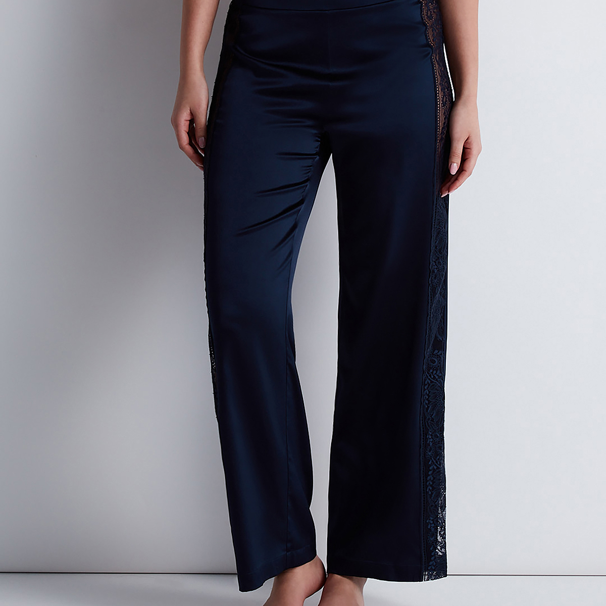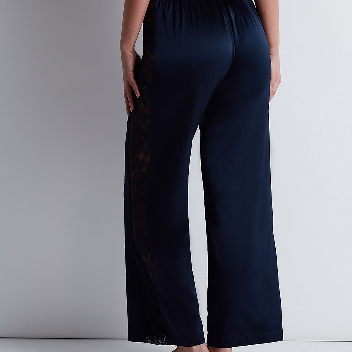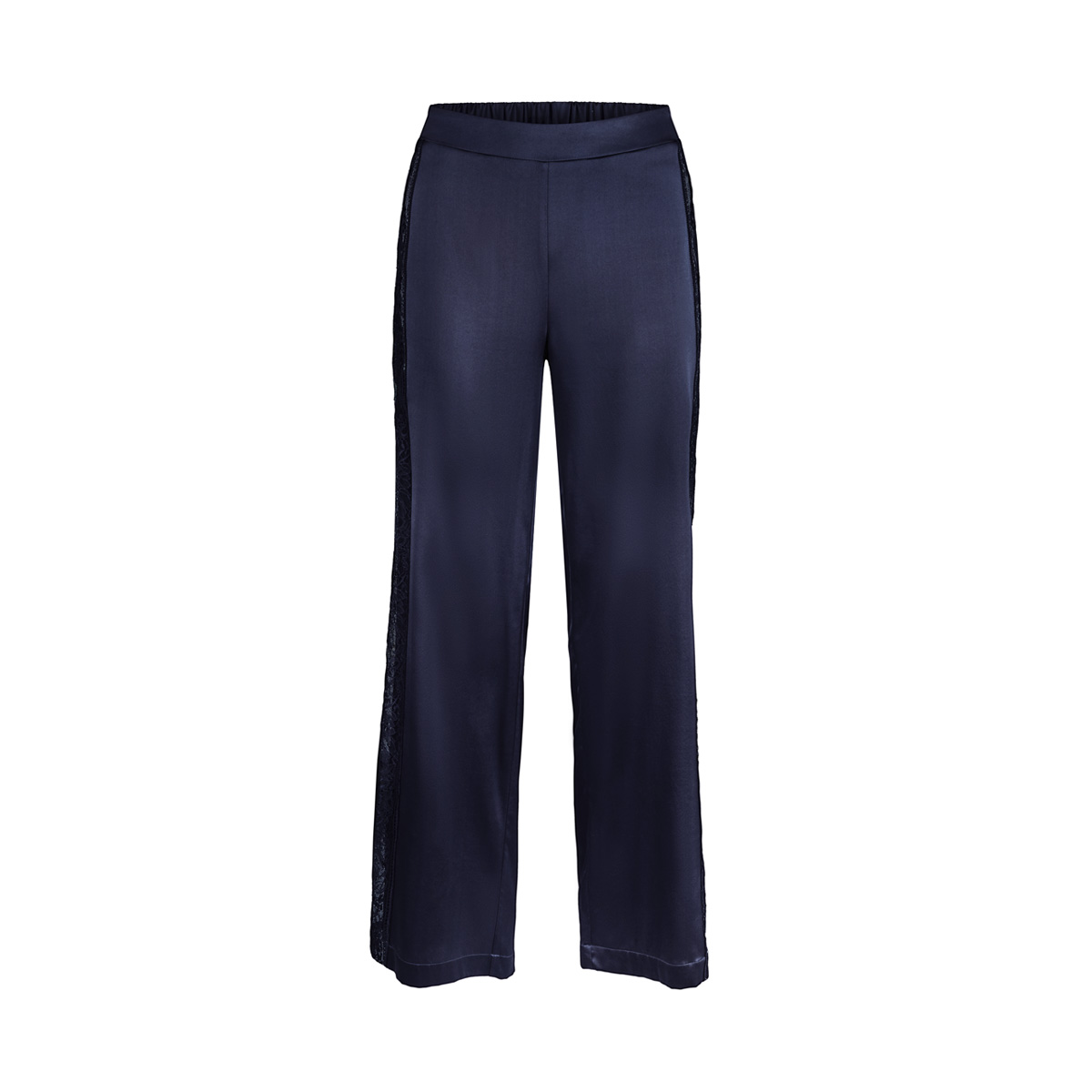Шелковые пижамные брюки свободного кроя. Имеют широкий эластичный пояс в области талии. Боковые панели имеют вставки из тюли с листовыми кружевными узорами.