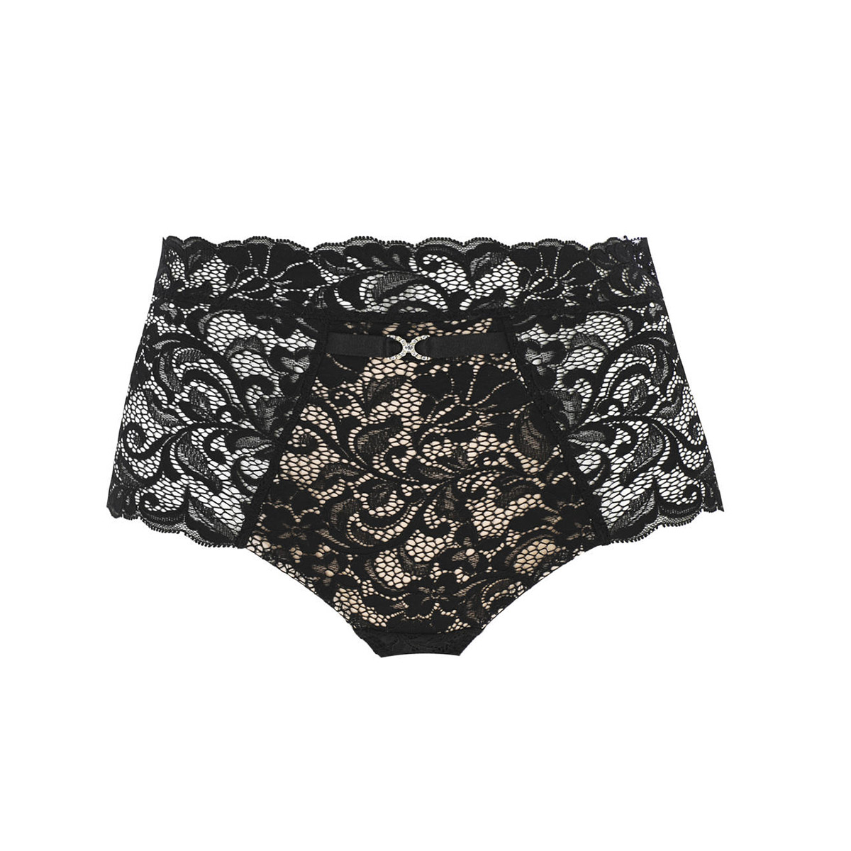 Трусы с высокой талией с высокой посадкой. Полностью выполнены из жаккардового кружева с цветочным орнаментом. Передняя панель дублирована для избежания прозрачности; дополнена атласной лентой с деликатным украшением. Достаточно широкий эластичный пояс по-верхнему краю обеспечит надеждую посадку и элегантный вид. Бесшовные нижние края на задней панели дополнены декоративными зубчиками.
