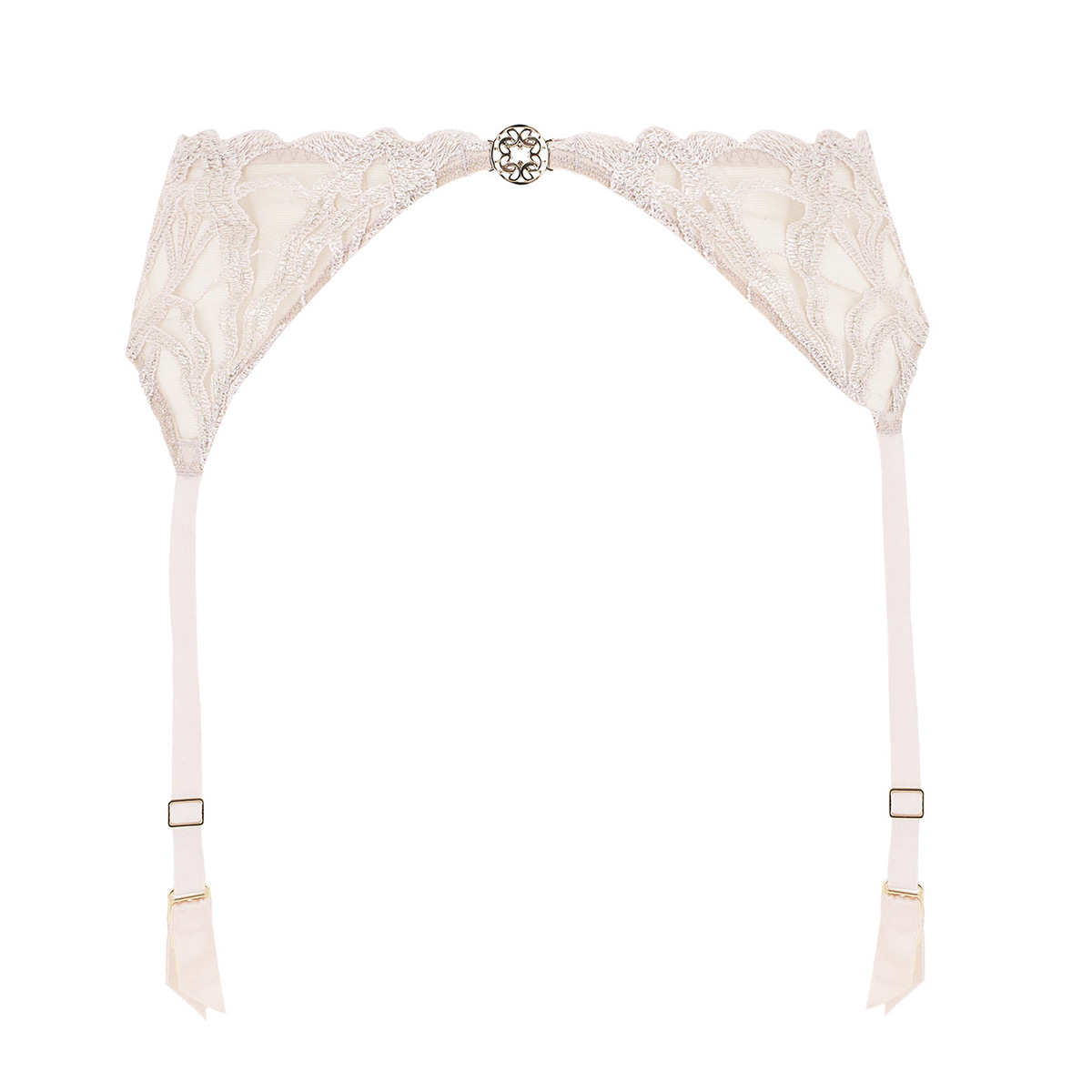 Пояс для чулок с 4 регулирующимися неотстегивающимися подтяжками. С высокой посадкой. Полностью выполнен из тюля расшитого французской вышивкой с вкраплением люрекса. На центральной панели разместился металлический аксессуар с логотипом дома моды Elie Saab.