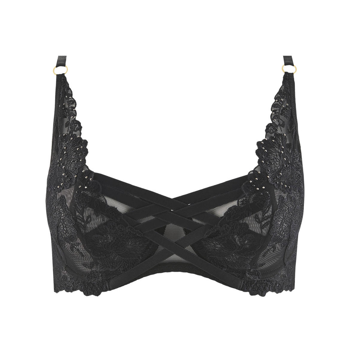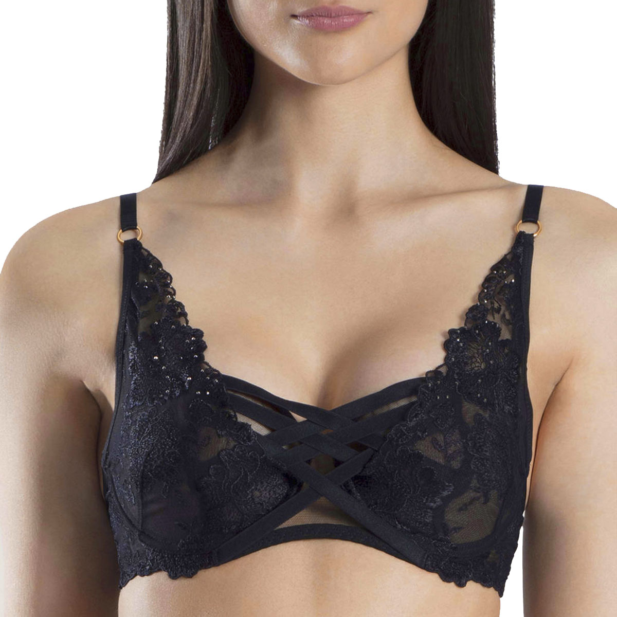 Бюстгальтер - балконет с мягкой достаточной открытой формой чашек на косточках. Чашки выполнены из расшитого цветочным орнаментом тюля, который плавно перетекает в бретели, соединяясь с ними золотым кольцом. Область декольте декорирована стразами, а цетральная панель - бархатными полосками, которые сливаются в шнуровку. Регулирующиеся бретели на задней панели выполнены в форме Эйфелевой башни.