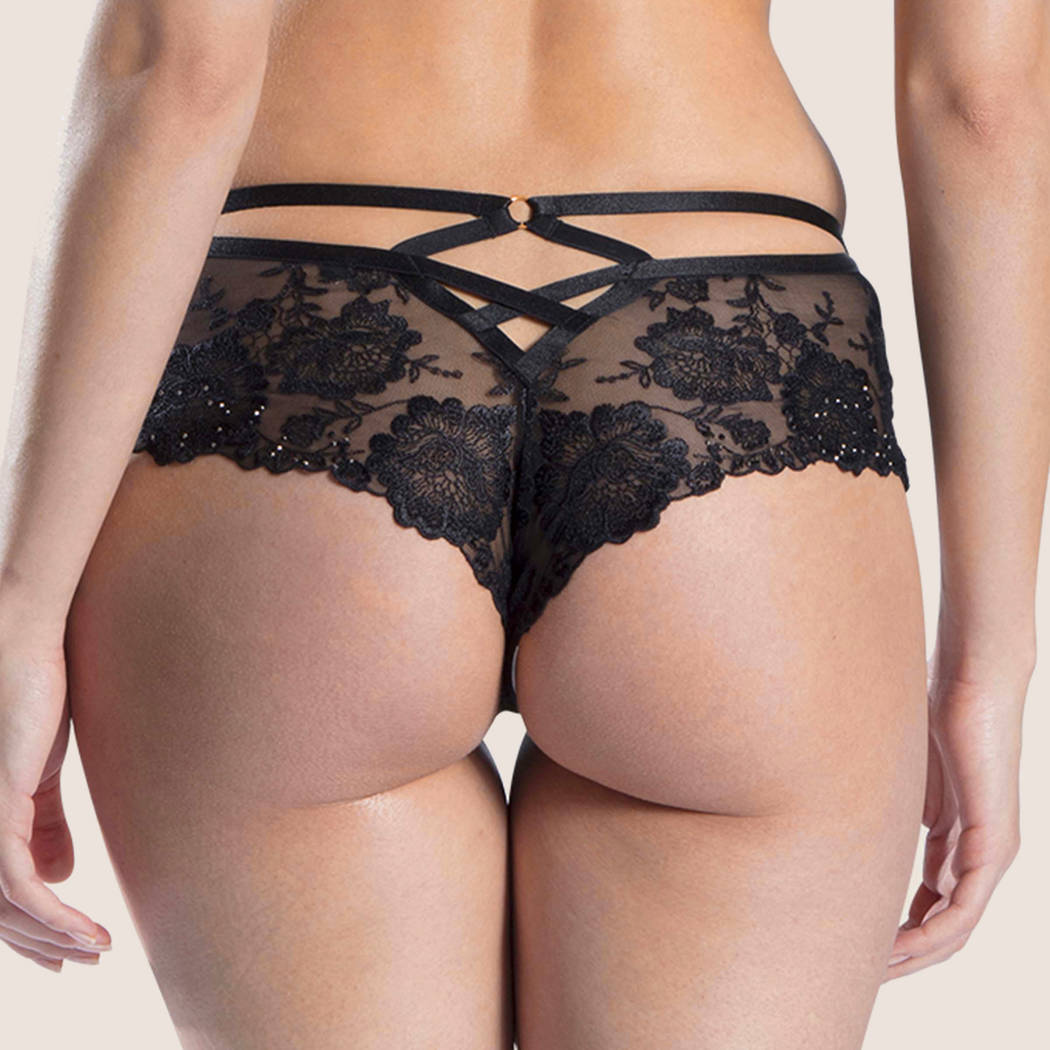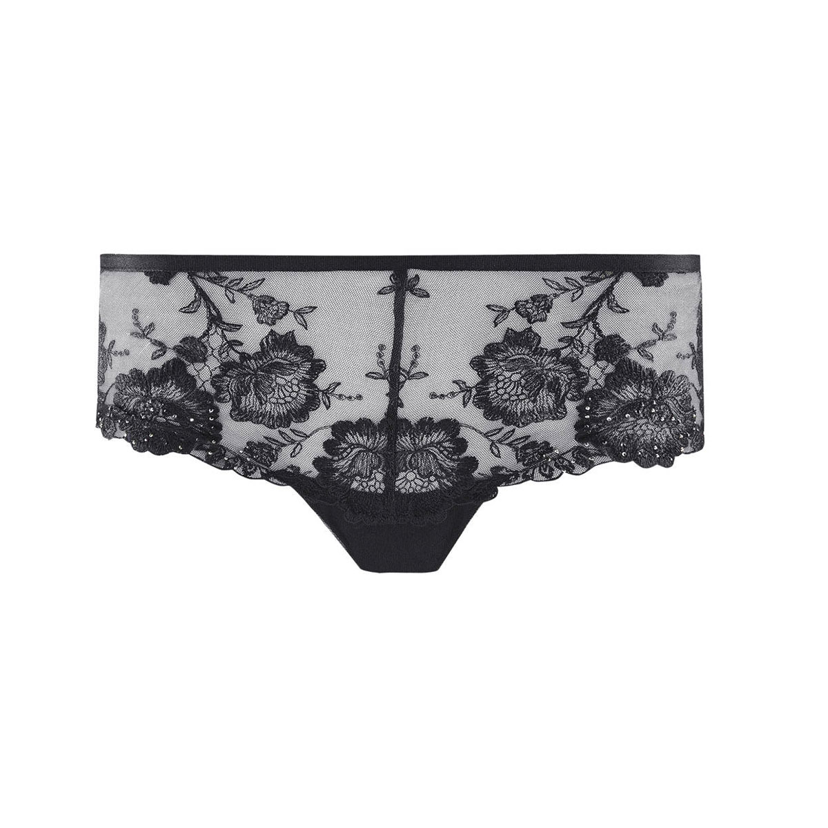 Трусы - боксеры со средне - заниженной посадкой. Полностью выполнены из расшитого цветочным орнаментом тюля. Нижние края передней панели дополнены стразами, задняя панель декорирована шнуровкой и стразами.