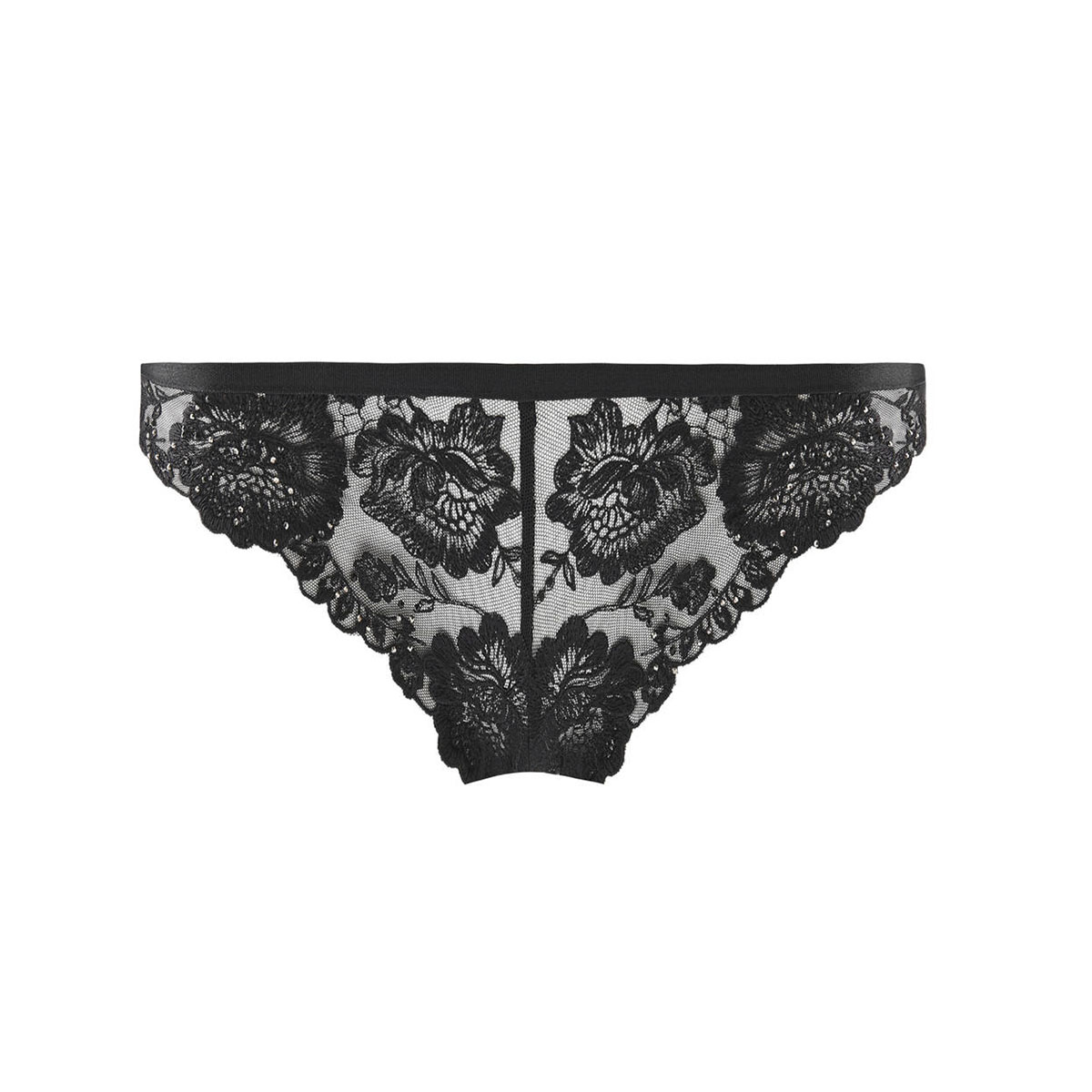 Трусы - стринги со средне - заниженной посадкой. Полностью выполнены из расшитого цветочным орнаментом тюля. Нижние края передней панели дополнены стразами, задняя панель декорирована шнуровкой и стразами.