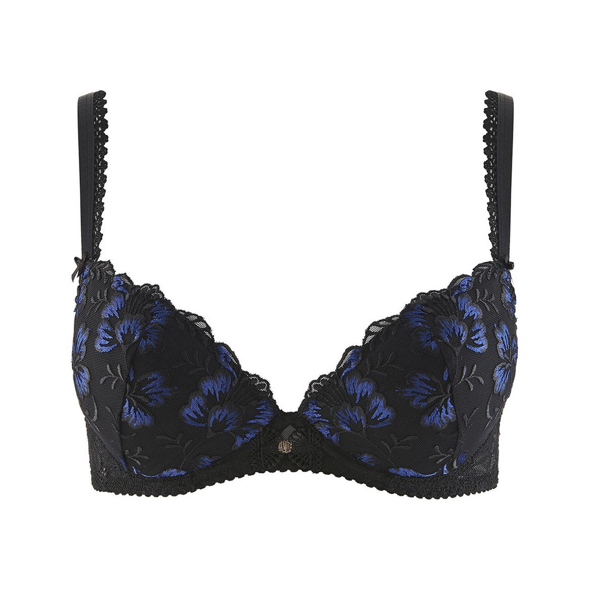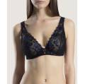 Бюстгальтер - пуш ап с уплотненной формой чашек с вынимающимися подушками. Чашки покрыты расшитым цветочным орнаментом тюлем. На центральной панели разместился бантик. Регулирующиеся бретели.