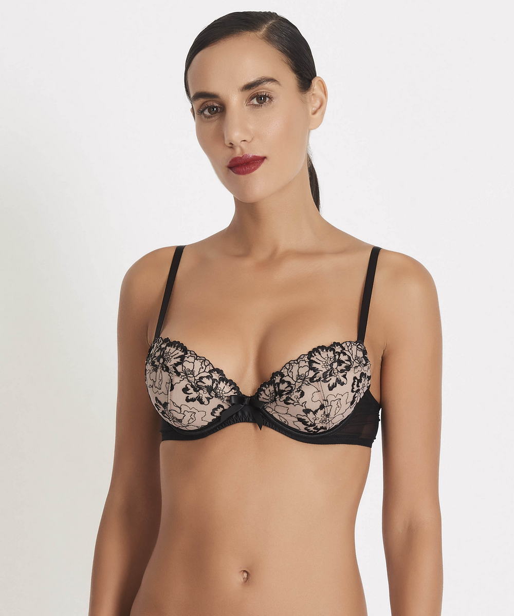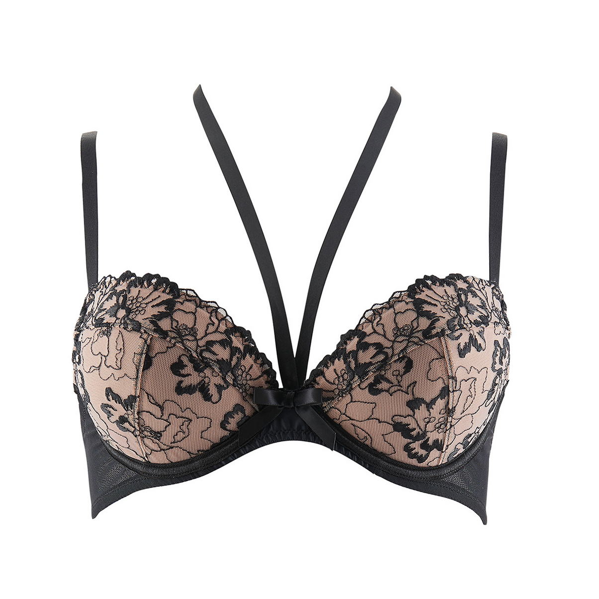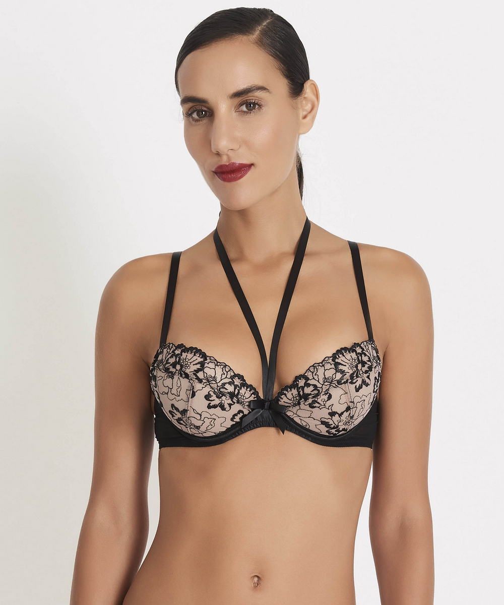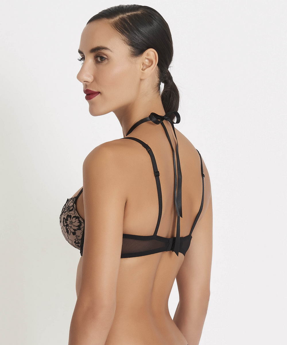 Бюстгальтер пуш ап с уплотненной формой чашек на косточках, с вынимающимися подушками. Чашки бюстгальтера покрыты тюлем телесного цвета и декорированы черной вышивкой - для создания эффекта рисунка на теле. "Атласные" бретели и лента вокруг шеи, которую можно отстегнуть. Основа бюстгальтера и боковые панели выполнены из микрофибры.