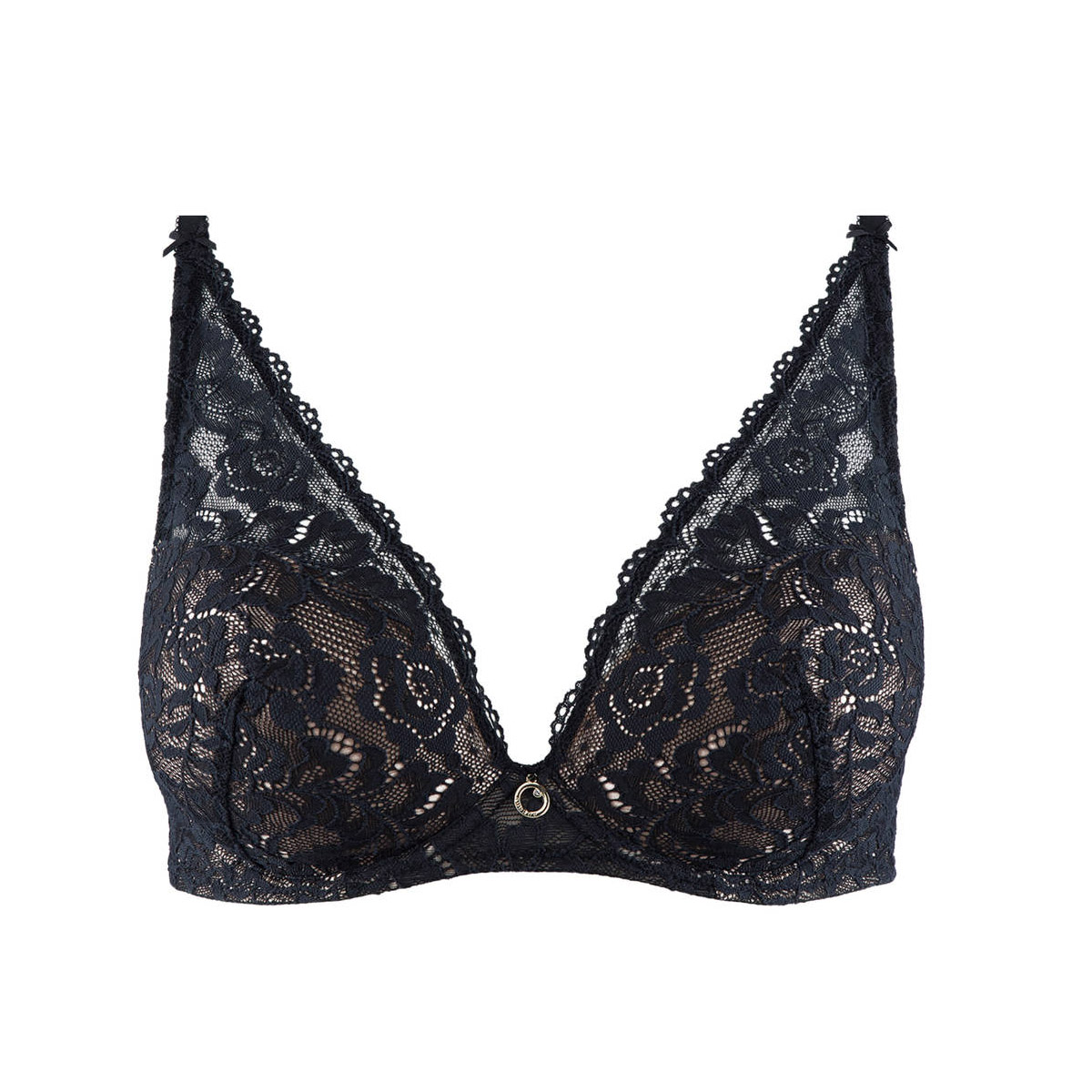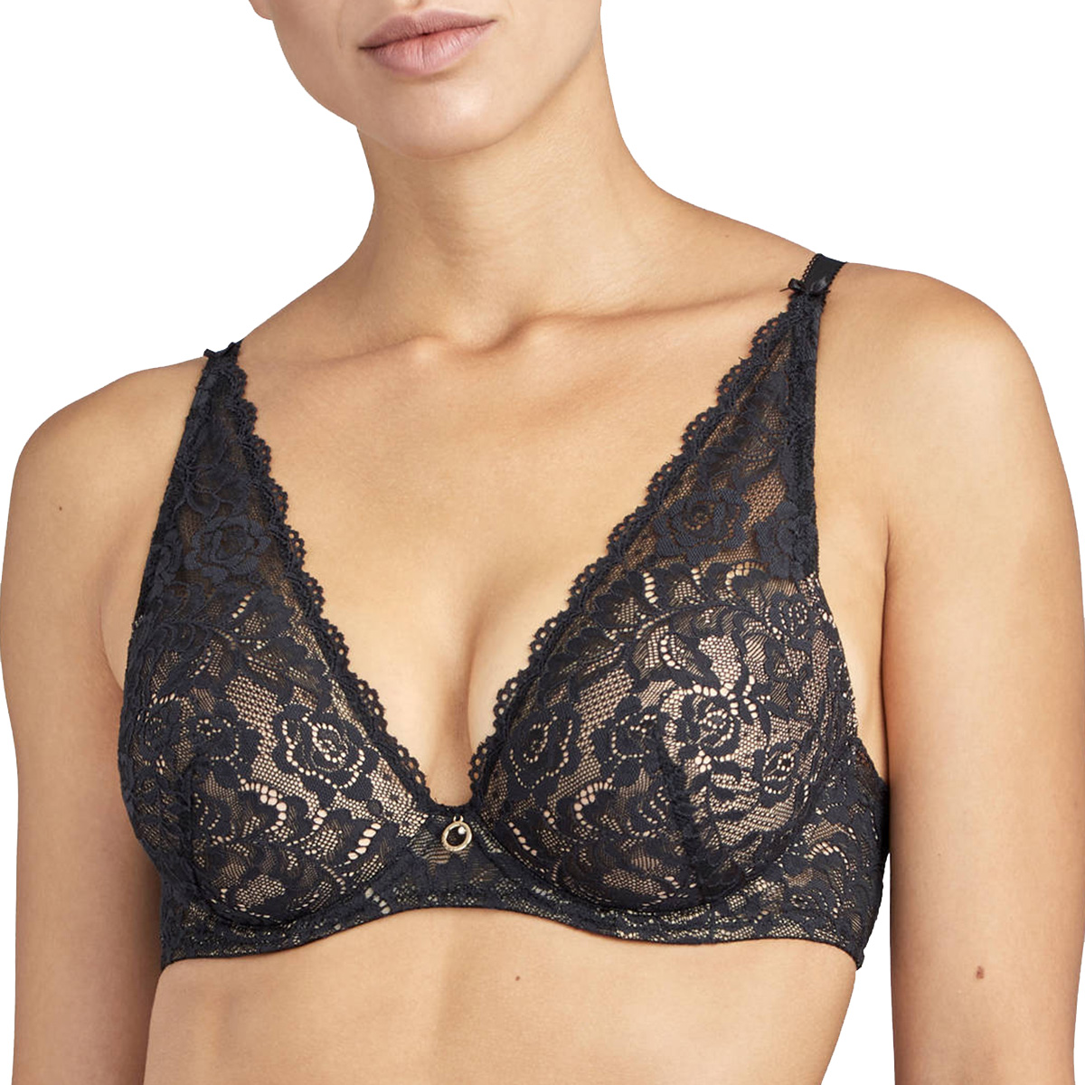 Бюстгальтер - пуш ап с интегрированными подушками на косточках. Чашки покрыты кружевом с цветочным орнаментом. Область декольте дополнена декоративными зубчиками. На центральной панели разместилось маленькое "золотое" колечко со стразой от Сваровски. Регулирующиеся бретели на задней панели декорированы кружевной отделкой, которая символизирует Эйфелевую башню.
