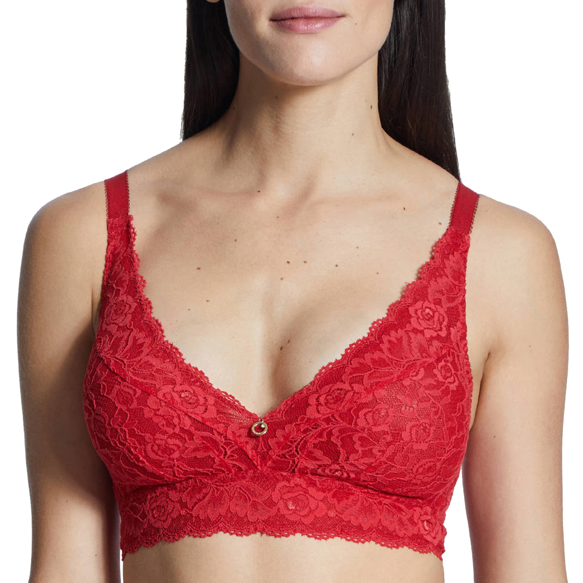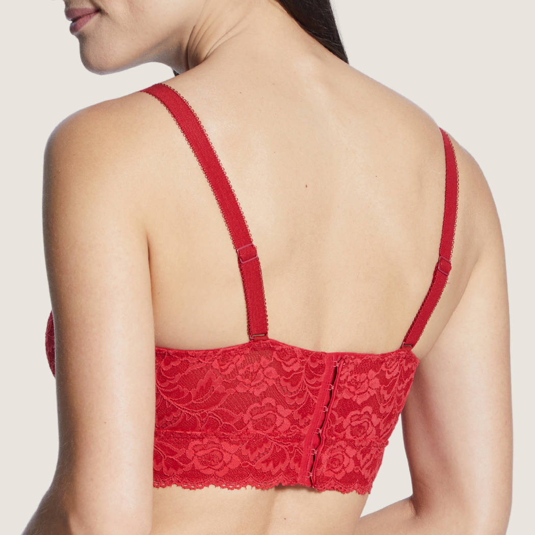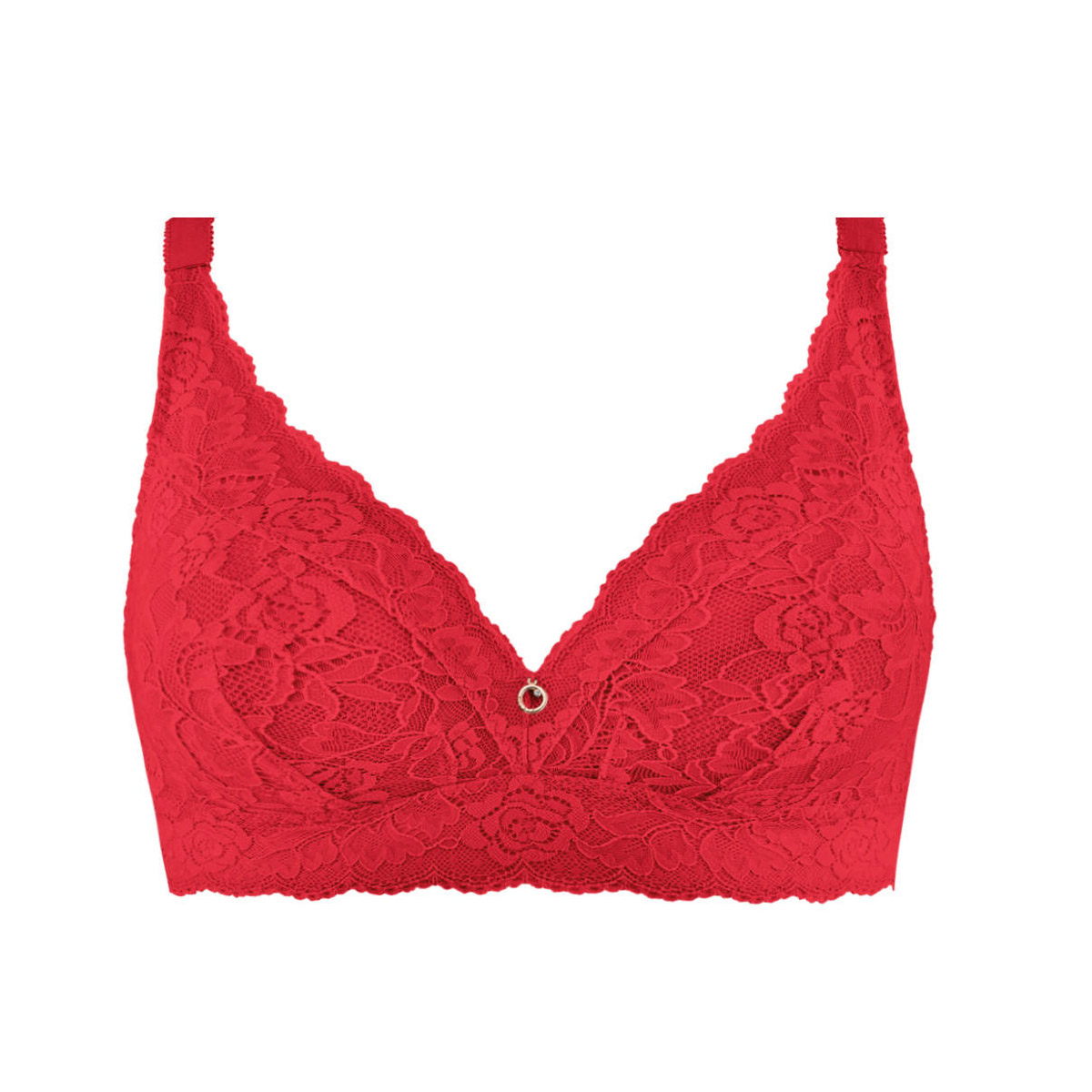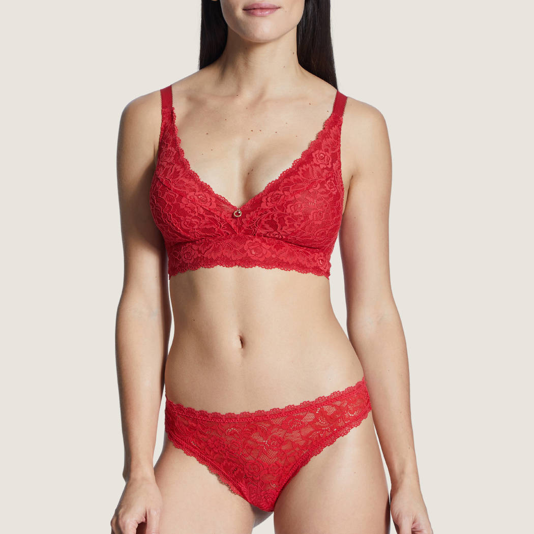 Бюстгальтер - бралет с мягкой треугольной формой чашек, без косточек. Чашки выполнены из кружева с цветочным орнаментом и, с внутренней стороны, дублированы тюлем для придания необходимой поддержки. Область декольте дополнена декоративными зубчиками. На центральной панели разместилось маленькое "золотое" колечко со стразой от Сваровски. Основа бюстгальтера - кружевная тесьма. Очень широкие боковые панели и регулирующиеся бретели.