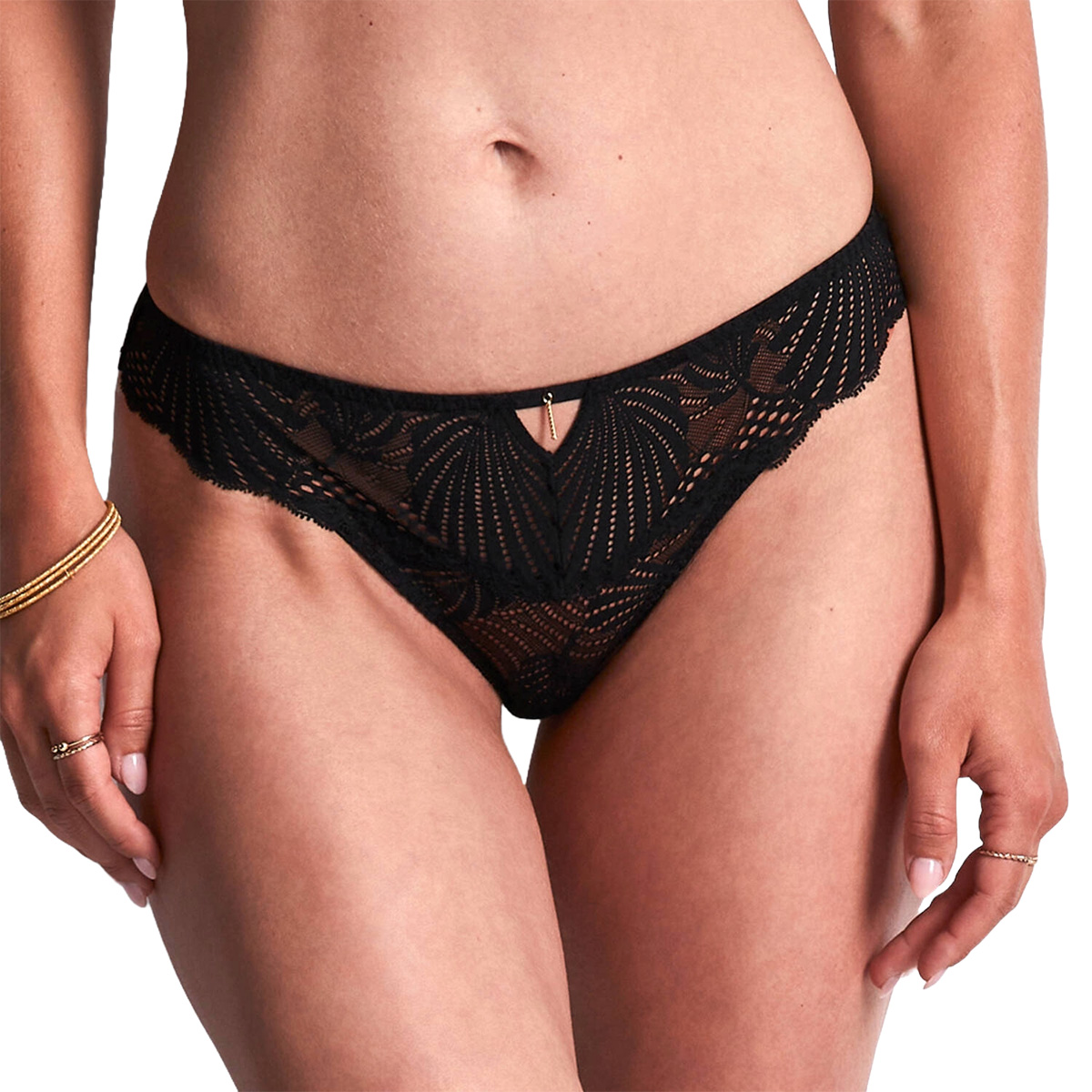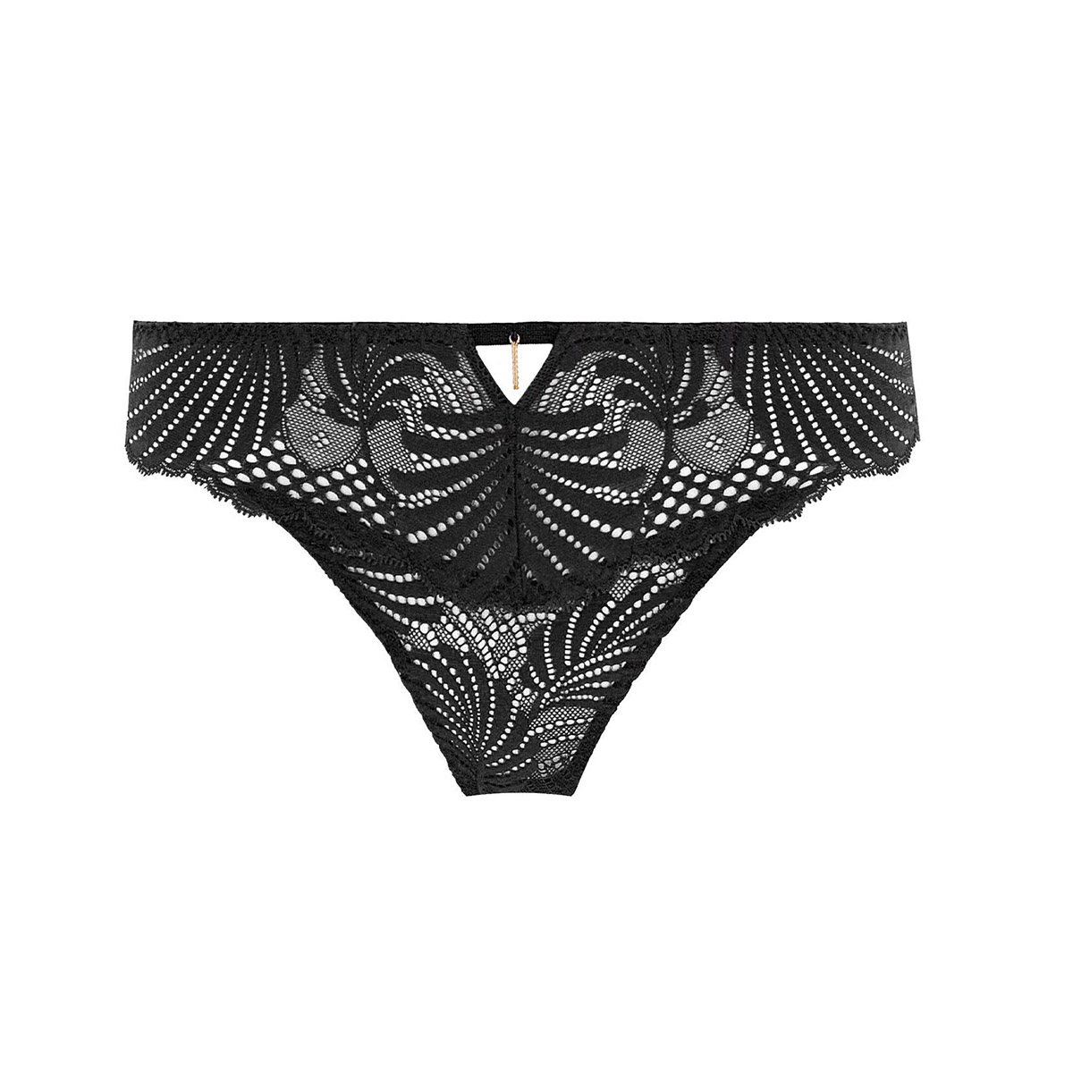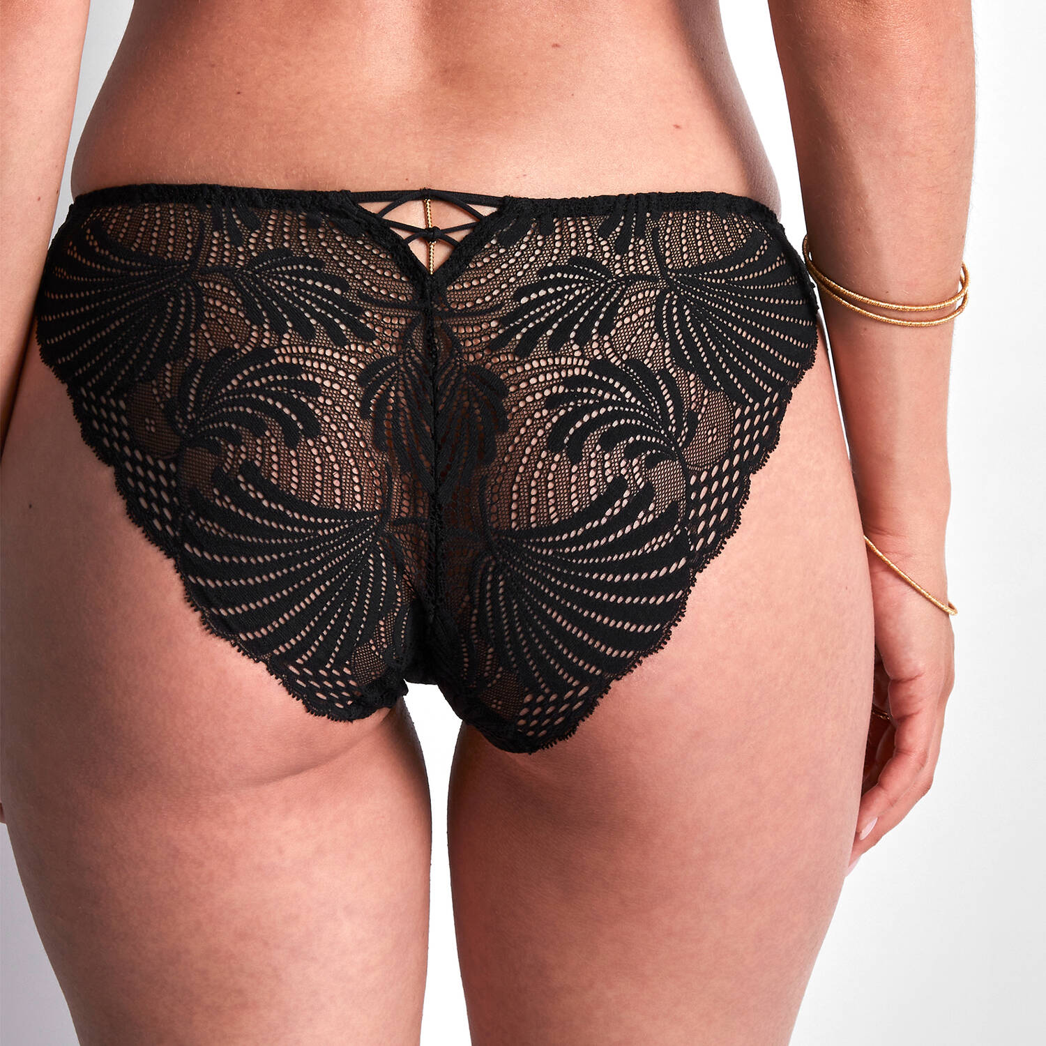 Трусы - бикини со средне-заниженной посадкой. Выполнены из жаккардового кружева, сделанного во Франции. Бесшовные нижние края - для маскимальной невидимости под одеждой. Передняя панель дополнена декоративной золотой спиралью, задняя - декоративной шнуровкой.